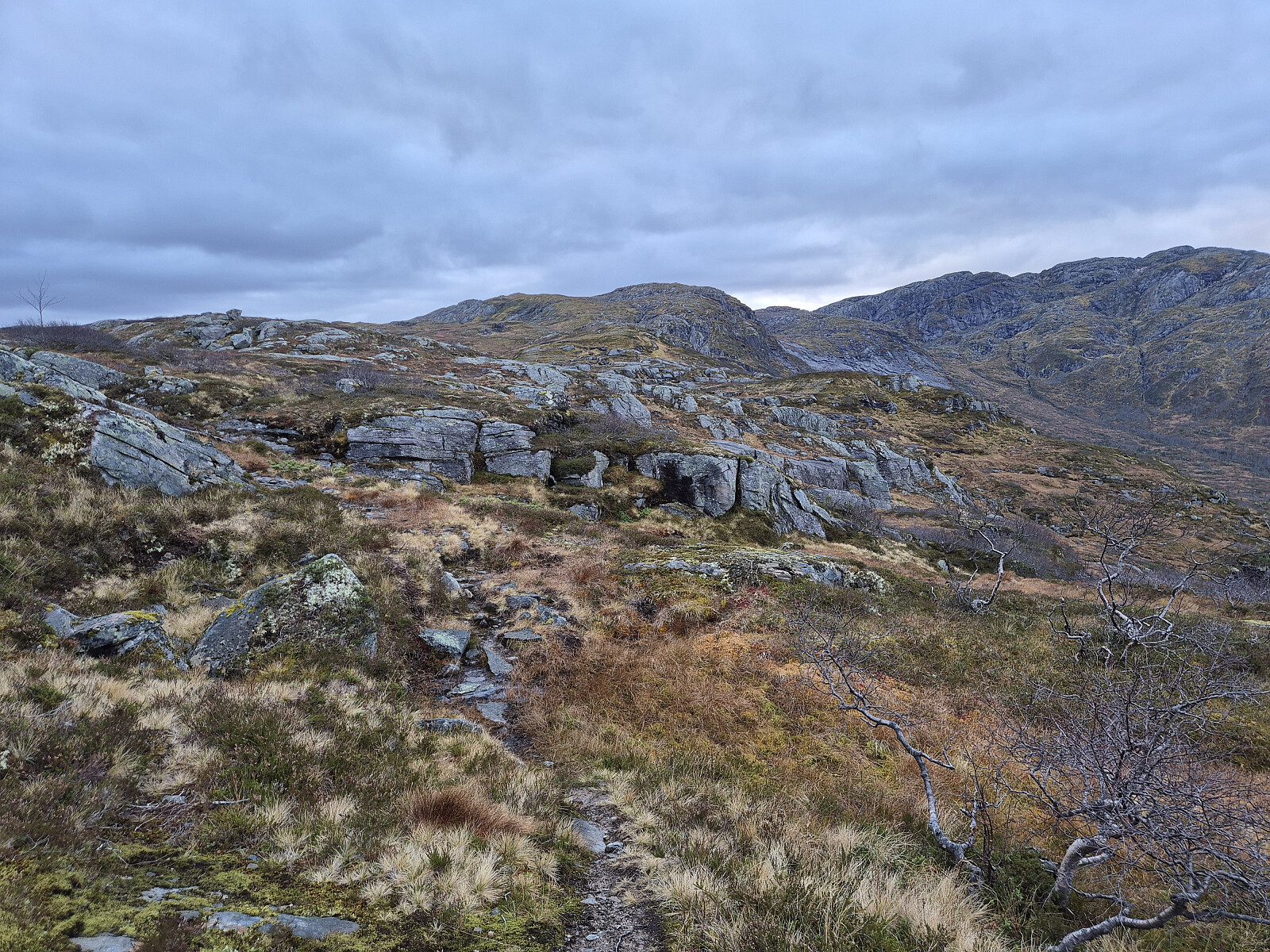 Frå Kvanngørdholten sikta eg meg opp mot Blåfjellet. Delvis tydeleg tråkk og delvis utan tråkk.
