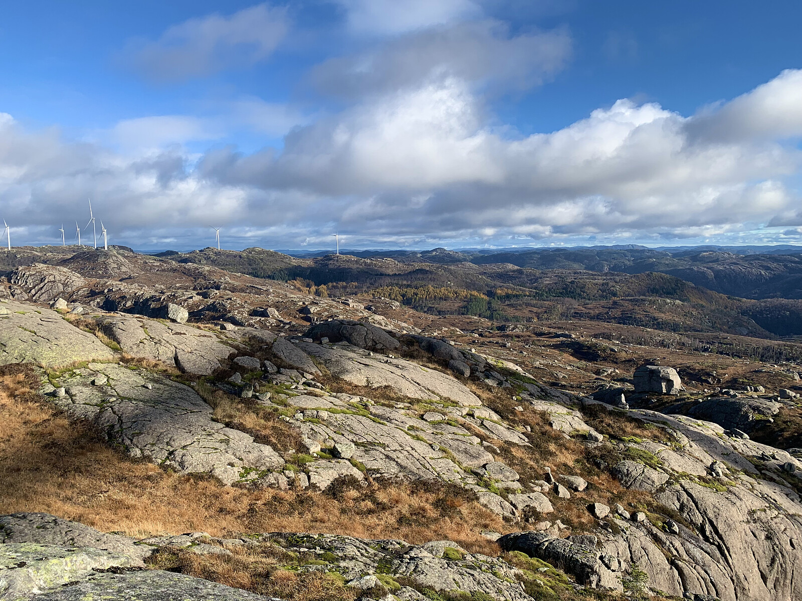 Tur i vindmølleland. Vi parkerte på parkeringsplassen ved Kvelland og gikk opp veien mot Voreknuten. Videre gikk vi sørvestover på vindmølleveiene til vi kom til Ørneheia, der det står en mølle nesten på toppen. Men fin utsikt mot havet, Lista og fjellene i vestre del av Agder.
