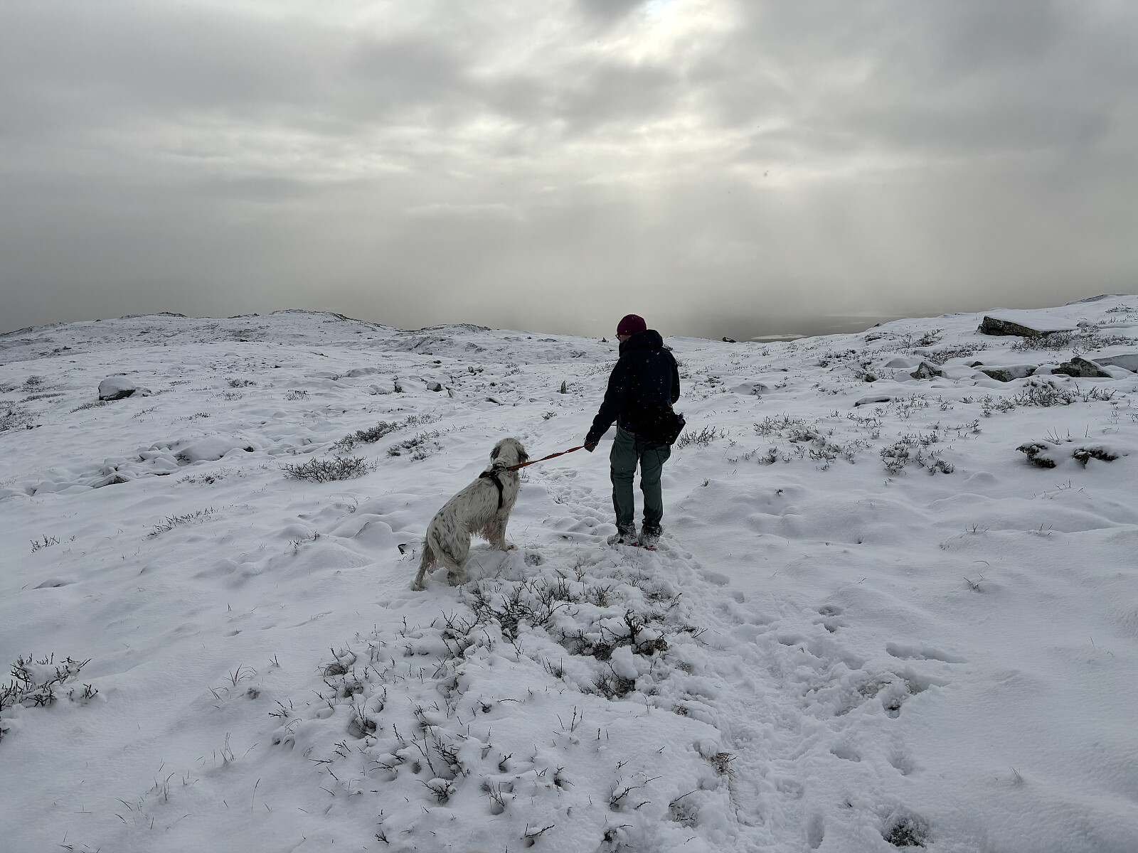 Tur med Anne Grete, Trym og Storm fra hytta. Vått innover myrene i dag, men også noe frost som gjorde det greit å gå. Vi gikk opp fra Ongsjølia og fikk litt snøvær på tur oppover. Mer og mer snø etterhvert som vi nærmet oss toppen, og riktig så vinter helt på toppen. Ikke så mye utsikt heller i dag, men fin stemning og temperatur. Liten rast i lia på tur nedover igjen. Ellers samme tur tilbake som opp.