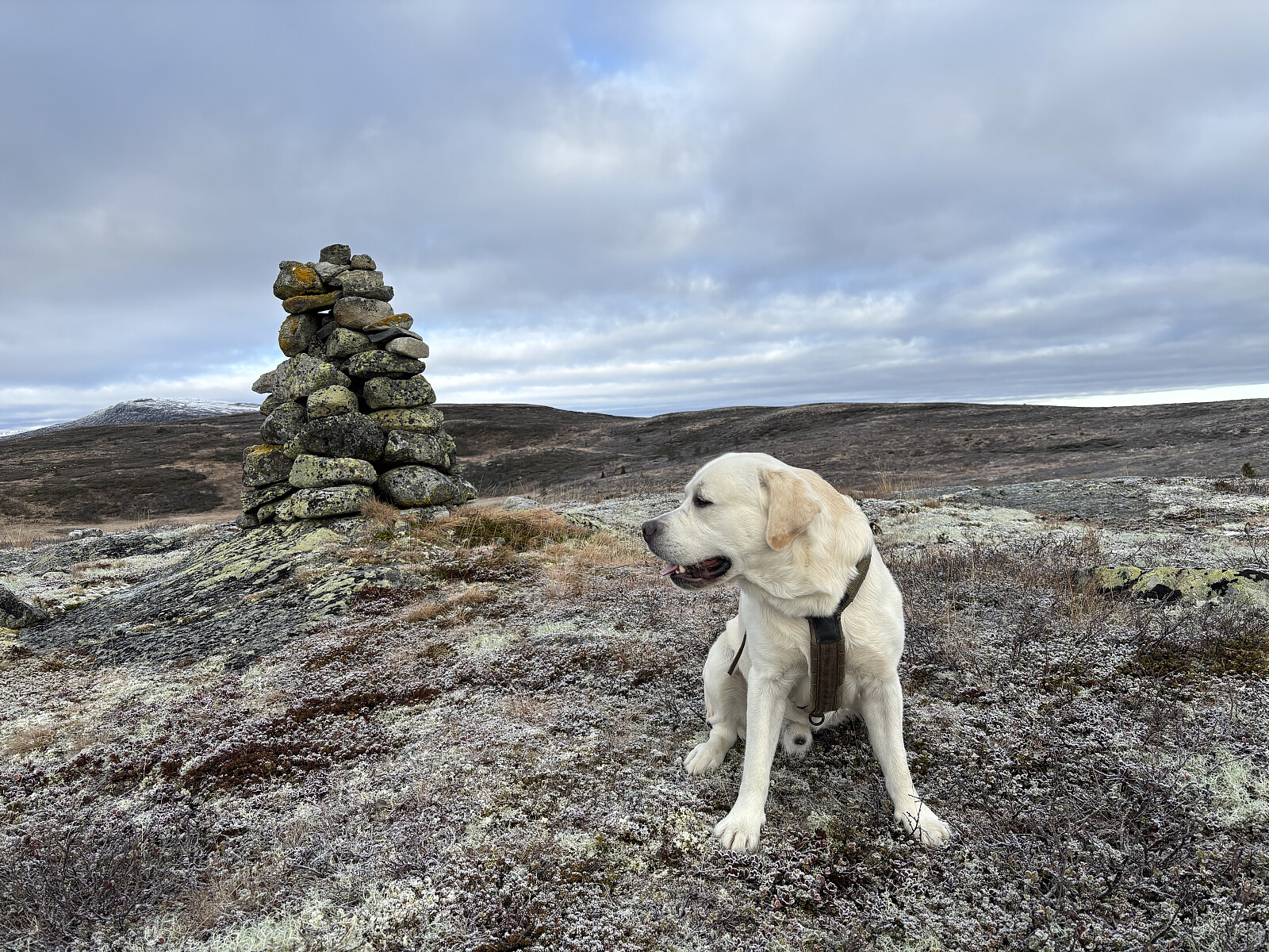 Kjørte til parkeringslomma ved Vetafjellet og Storm og jeg gikk først ut til sørtoppen før vi møtte Anne Grete, Laurits og Trym rett ved hovedtoppen. Frost i bakken som gjorde det nesten helt tørt å gå. Isen på pyttene bar Storm også.