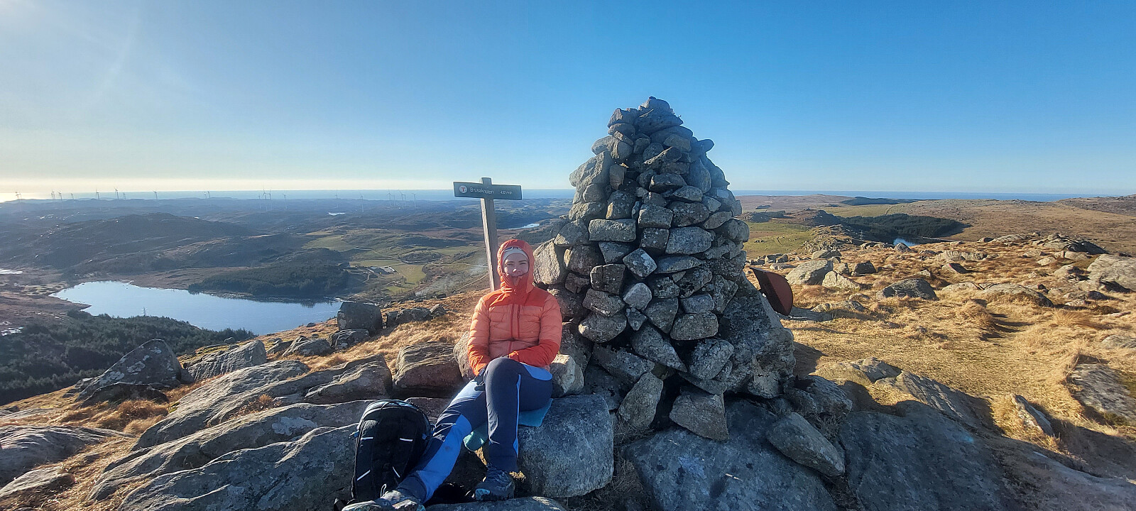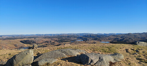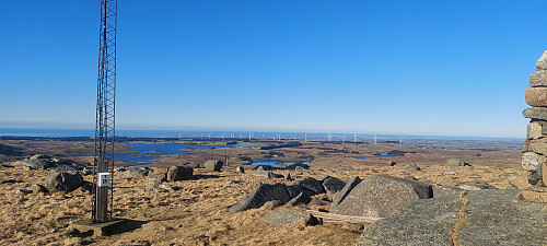 Flott utsikt også frå denne toppen, både ut i havet og innover heiane, men dessverre enormt med vindturbina i horisonten også her.