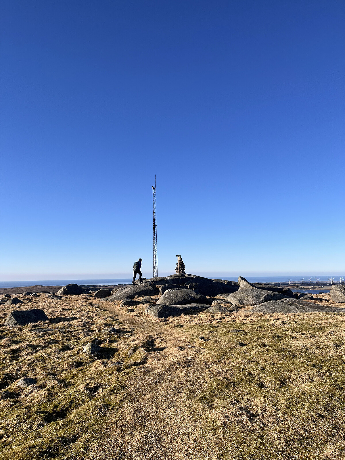 Siste topp som skulle bestigast på denne Rogalandsekspedisjonen var Brusaknuden. Først tok vi en tur oppom Karten. Opp her gjekk det traktoveg heile vegen. Flott topp med veldig god utsikt utover Jæren. Dessverre har vind-mafiaen tatt godt for seg her. Vindtrubinar i alle himmelretninger. Det var så groteskt mykje vindturbina at det skar i hjartet..