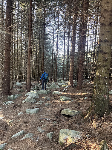 Frå Karten skar vi mot søraust og kom inn på stien mot Brusaknuden. Vidare gjekk stien gjennom ein tett granskog og opp ei lita stigning før vi kom opp på ei flate som førte bort til siste stigning mot toppen.