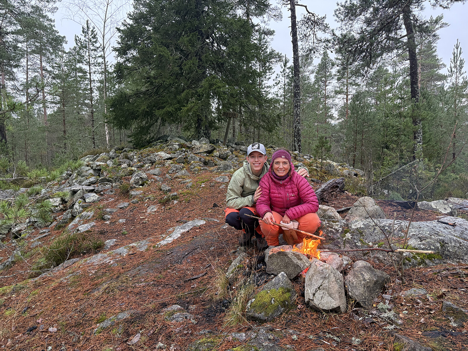 Det ble en koselig ettermiddag med bål og mat. Da det meldte regnværet kom, pakket vi sammen og ruslet ned igjen. Cecilie og Kristian var med.