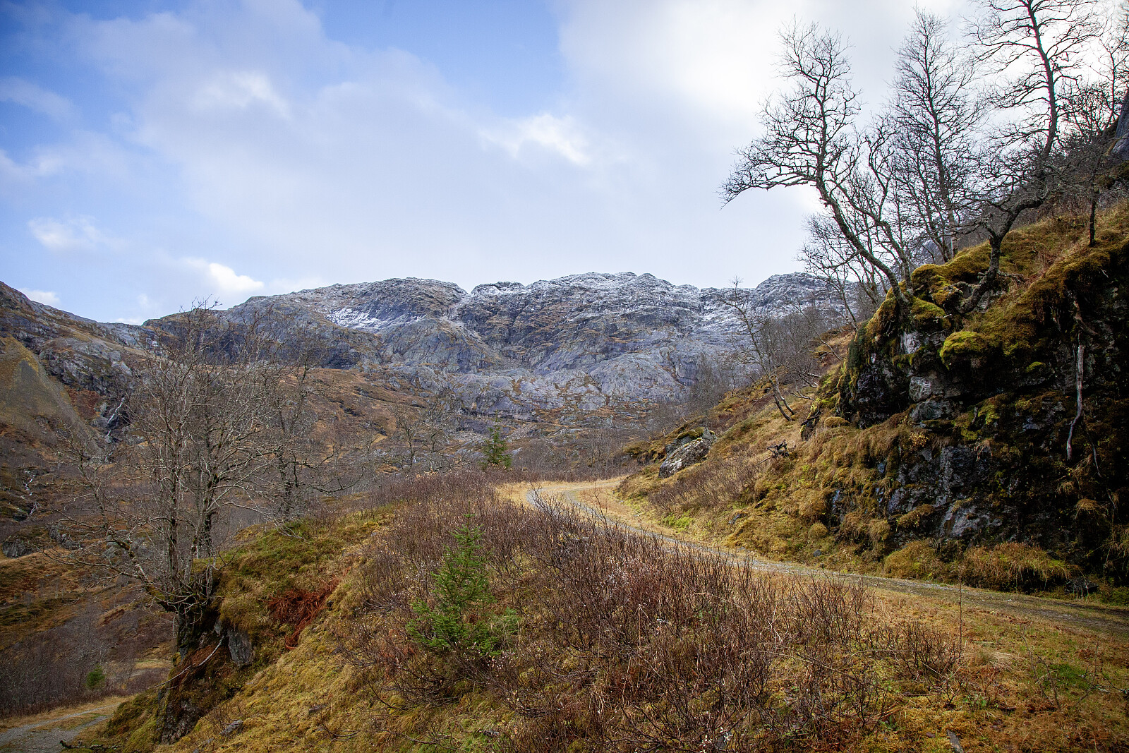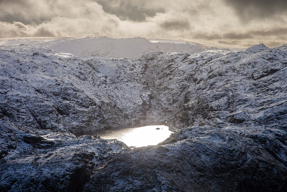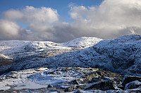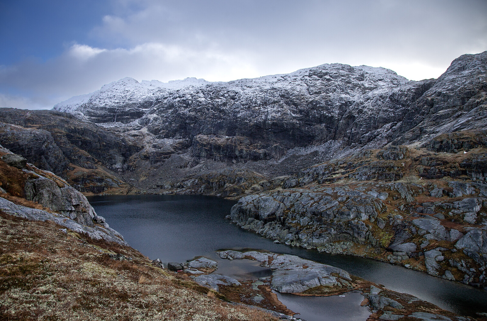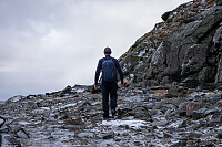 Jeg og Harald tok fergen over til Jondal og kjørte opp i Krossdalen til bommen før Botsvattnet, hvor det er en stor parkeringsplass. Fulgte herfra anleggsveien opp i Skarvabotnen. Videre på T-merket sti. Ganske surt novembervær. Nysnø fra ca 1200 moh. Et voldsomt kupert landskap rundt Folgefonna her, med dype daler, bratte knauser og skikkelig mikroterreng.
