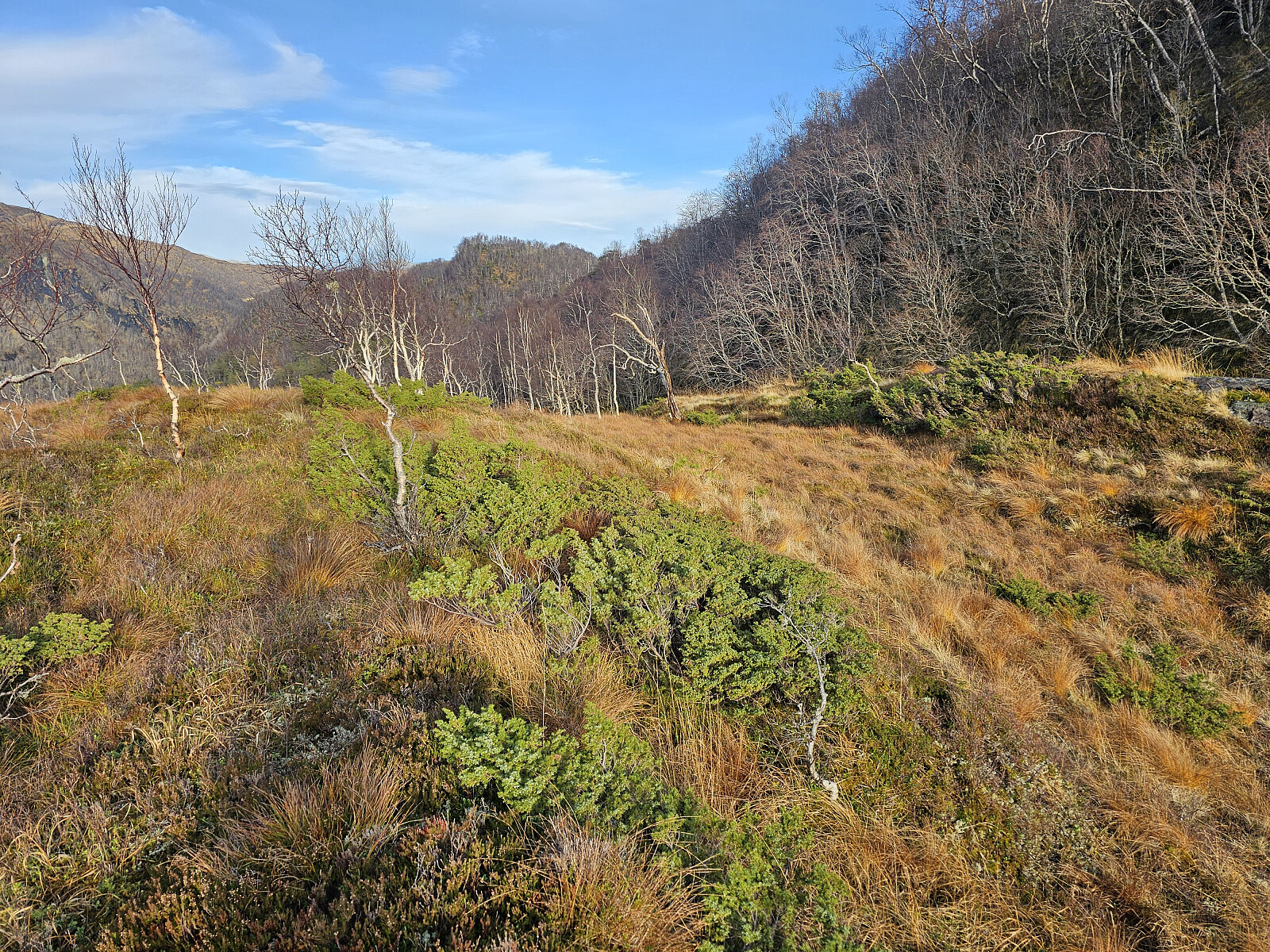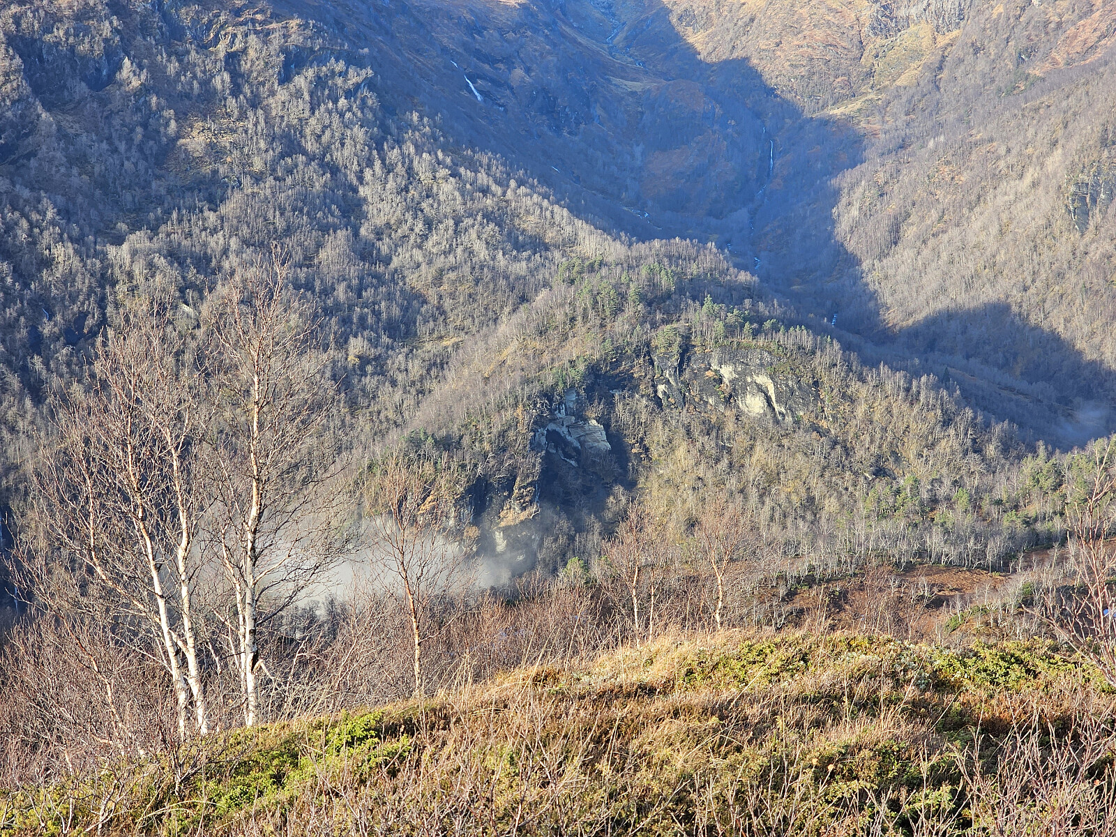 Videre til Gåsaflukta et litt utilgjengelig fjell utspring i fjellsiden mellom Haukåsfjellet og Strandadalen. Måtte 250 bratte meter nedover i bjørkelien til jeg kom til et større flate med lyng og noen småtrær. Mye dyre tråkk i bjørkelien som jeg delvis fulgte.