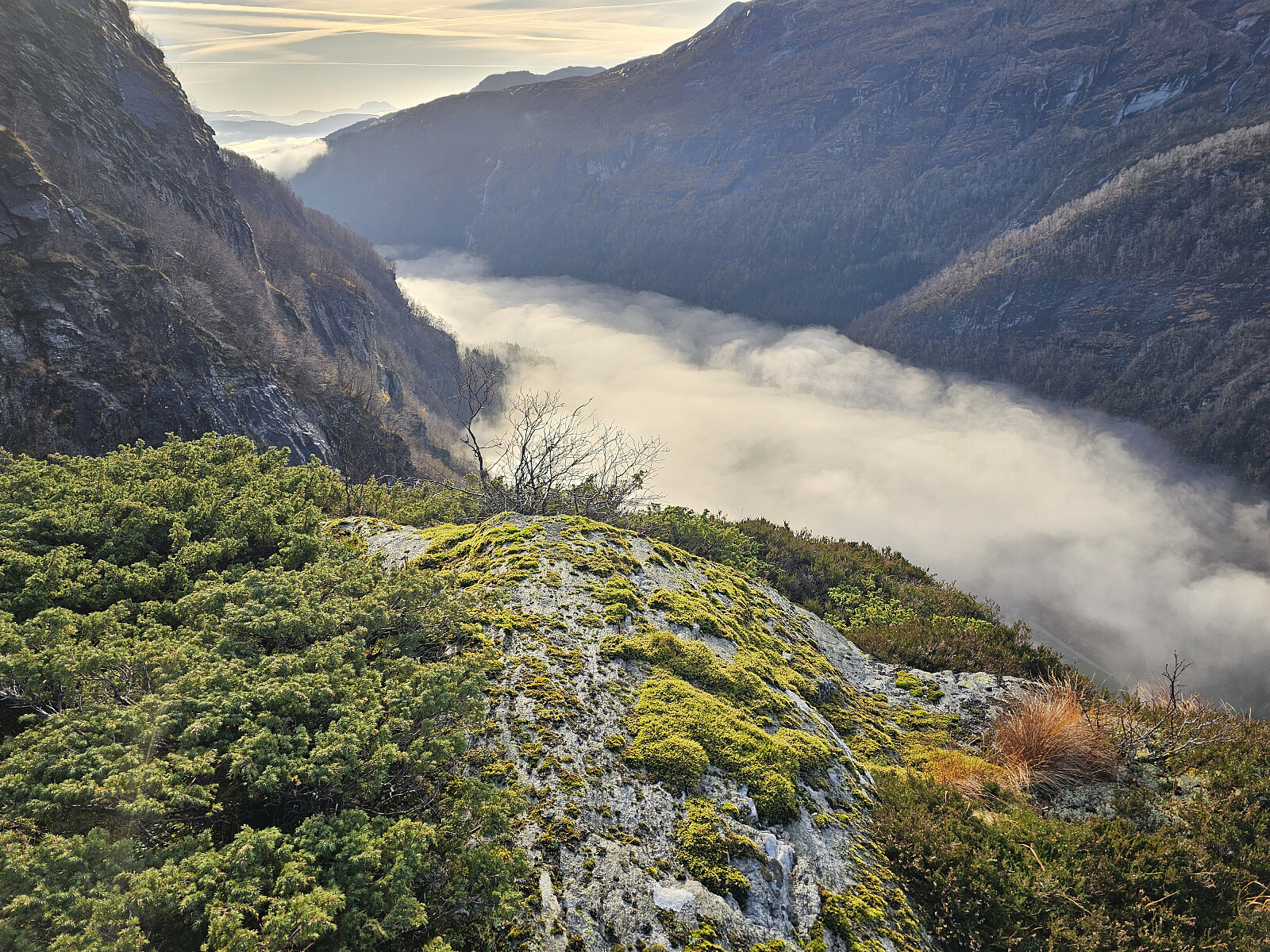 Hardangerfjorden og Strandebarm i tåke sett fra Haukåsfjellet