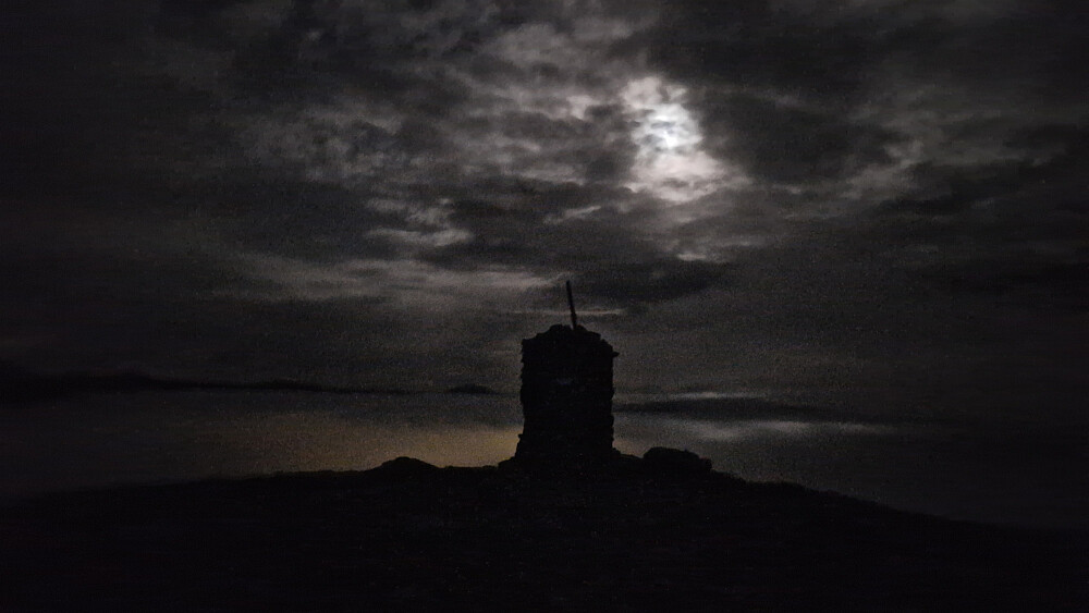 Tåke nedi bygda så det ble ganske så fint å komme opp over tåka. Fint med litt månelys og det hvite teppe over dalen. Kveldstur via Molldalsetra med Aron