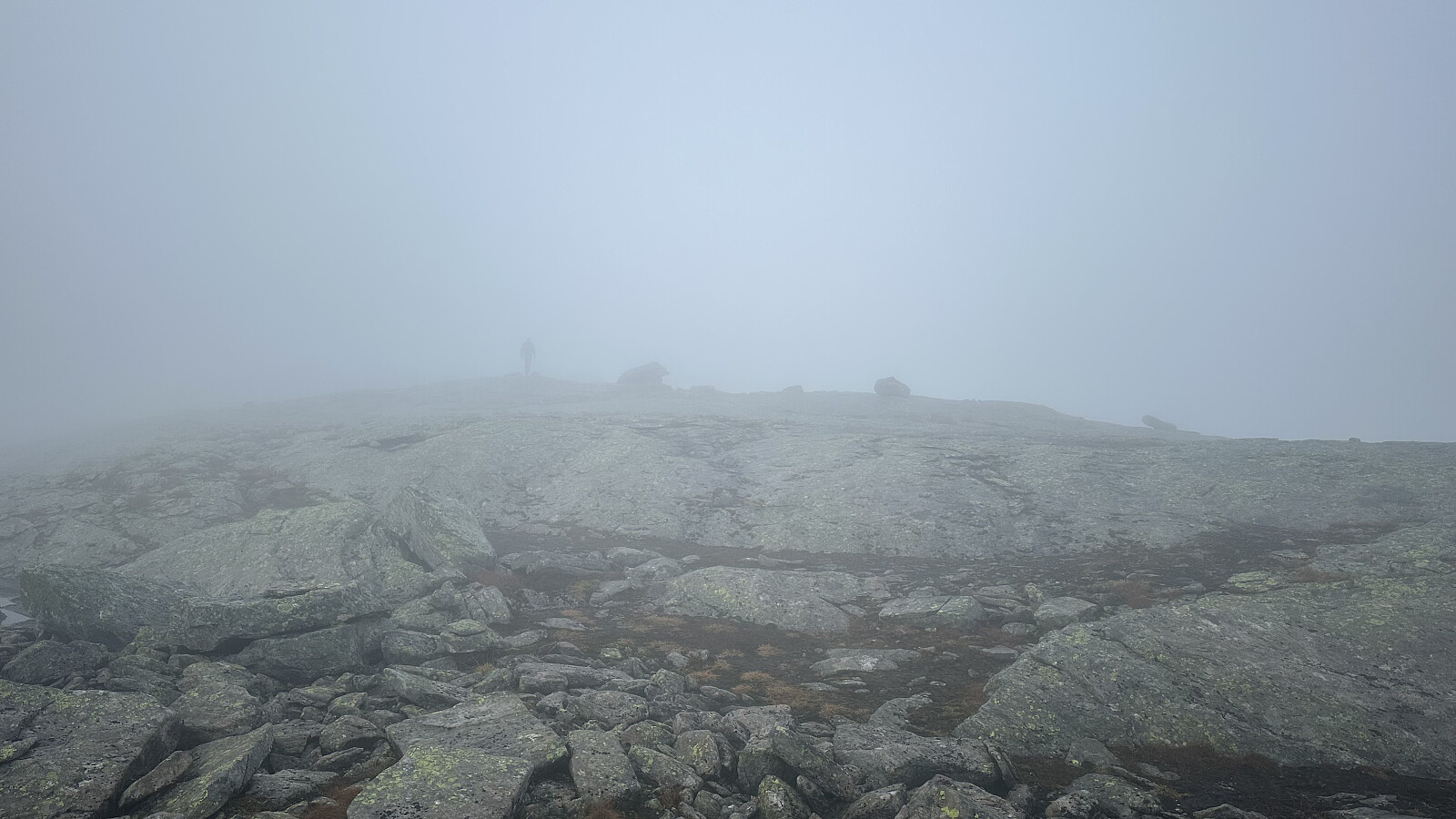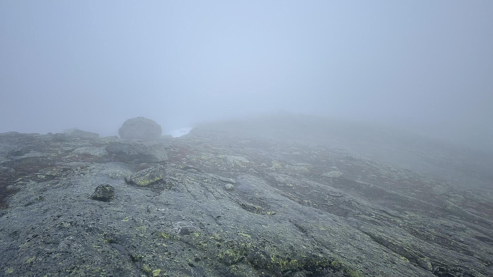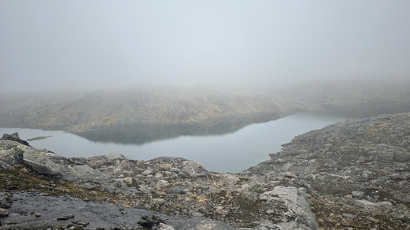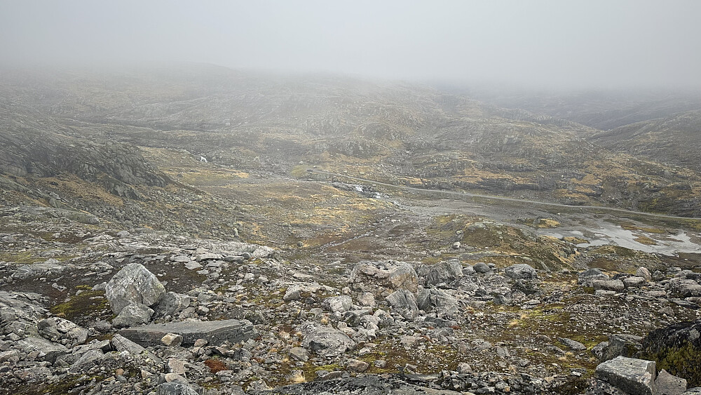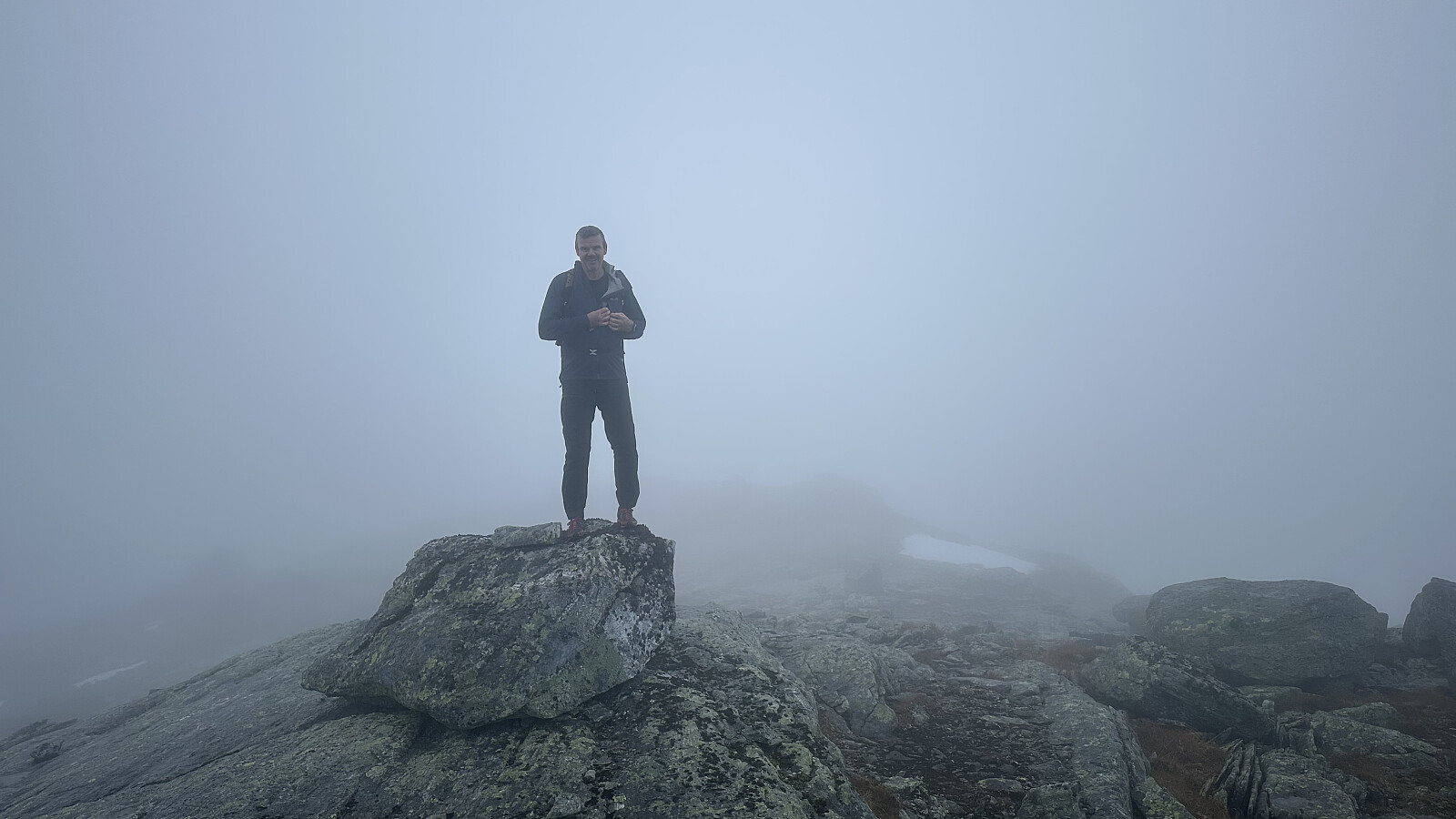 Fint å overnatta her oppe ved nesten startutgangspunkt. Nydelig med ein stjerneklar nattehimmel og skodde som kom trolsk. Det var meldt lettskya og sol for turdagen. Men, skodda låg og det vart å navigere etter gps.