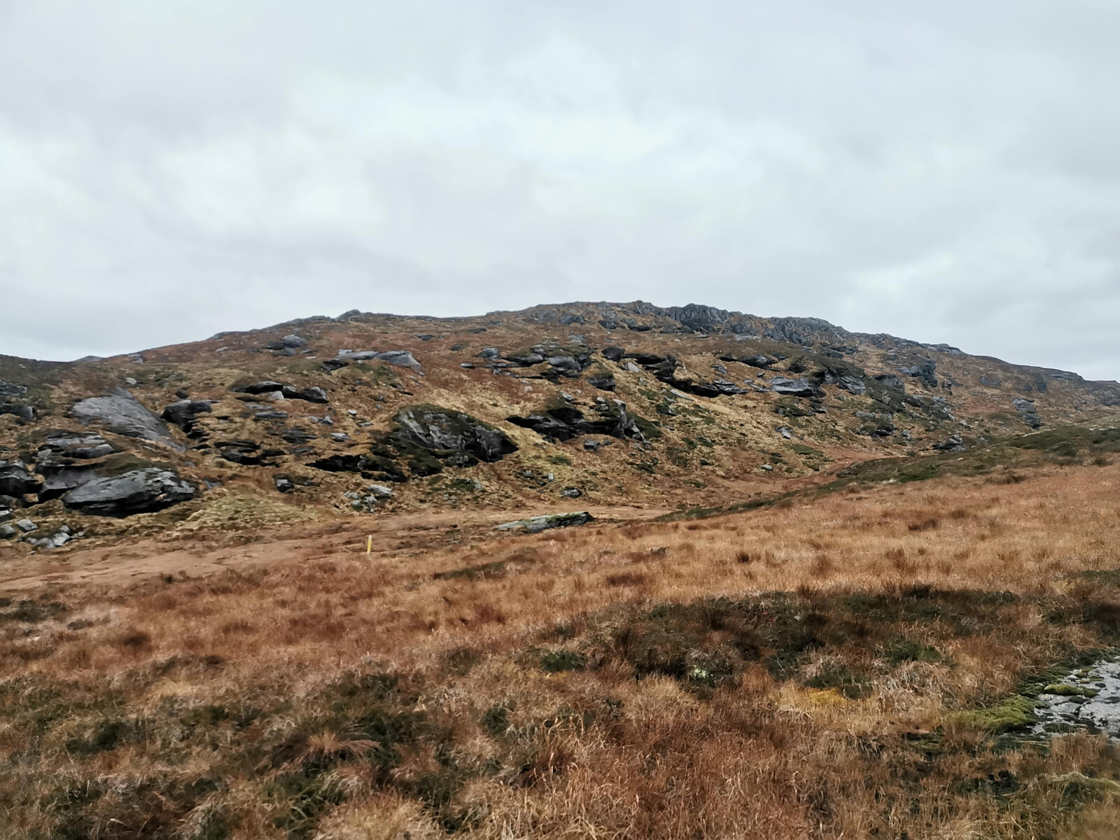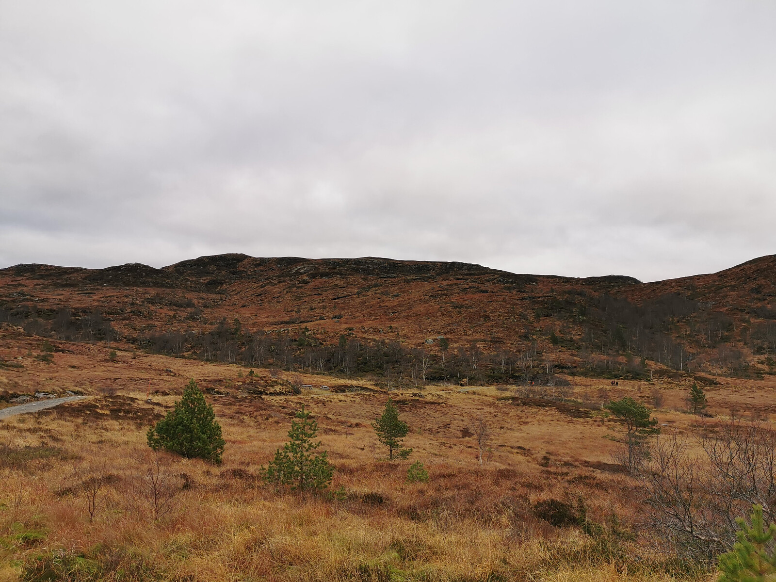 Tidligere på dagen hadde jeg vært på Heia og Matskårhaugane, så klokken var blitt 13:47 da jeg satte kursen innover grusveien mot Olalihytta. Tok av fra veien og gikk opp på Steinfjellet og over på Staurskornibbene. Godt merket, men meget bløt sti stort sett hele veien.