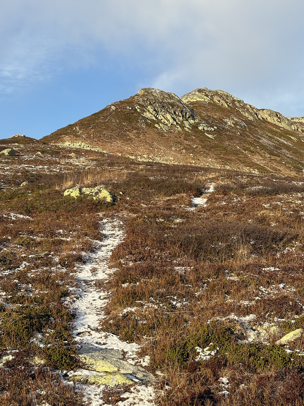 Vi kunne ikke se noe tydelig sti i det tynne snø/rim-laget så vet ikke om den finnes. Vi traverserte litt nord-nordvest nedover lia og fant de fineste traseene på lyng ned mot ei tydelig ravine hvor vi oberserverte en sti både på toppen av ryggen samt en nede i søkket.