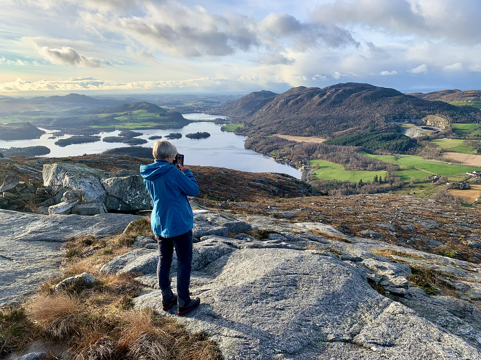 Tur fra hytta på Hogstad. Først inn til Hogstadvika og så opp til Gjerdeheia på gårdsvei. Videre på merket sti til toppen. Noe glatt og sølete, men fint og stille vær.