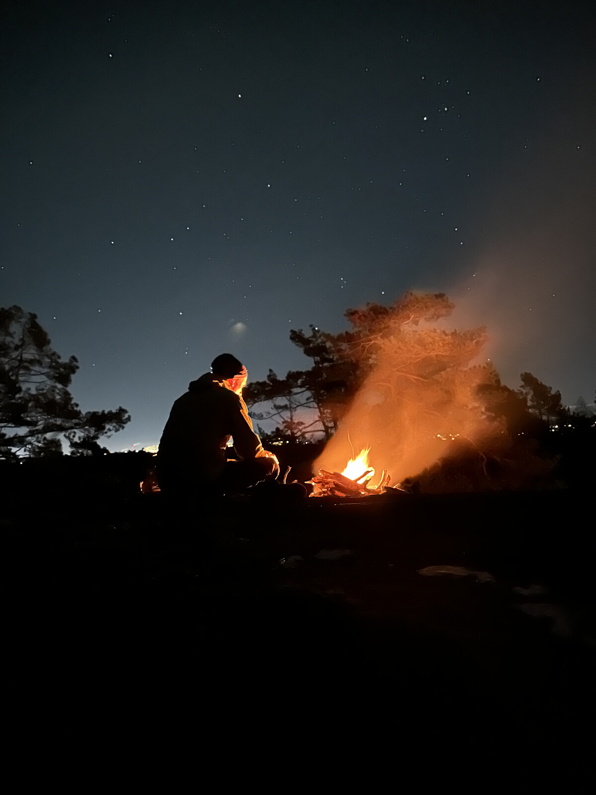 Samla noe ved og fyrte opp bålet. Brukte en etablert bålplass, syns det er greit siden det er bymarka. Den blir fort slitt.