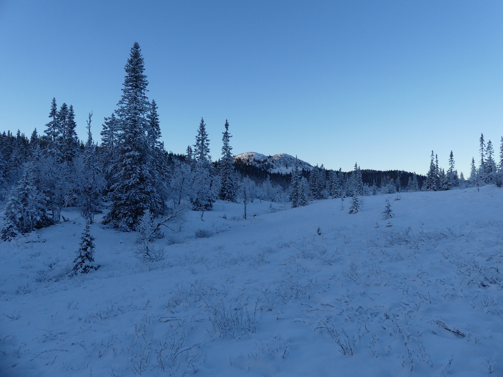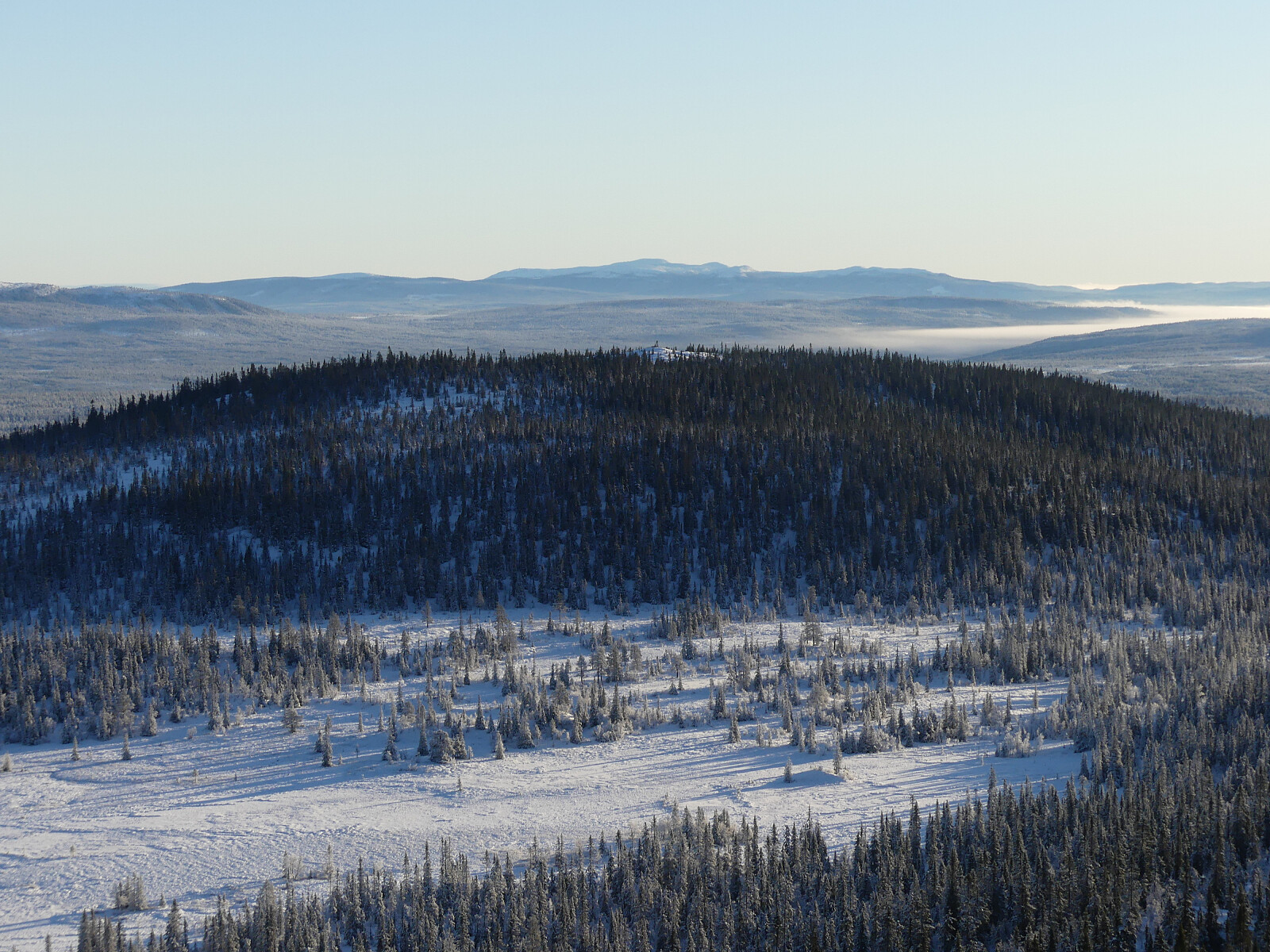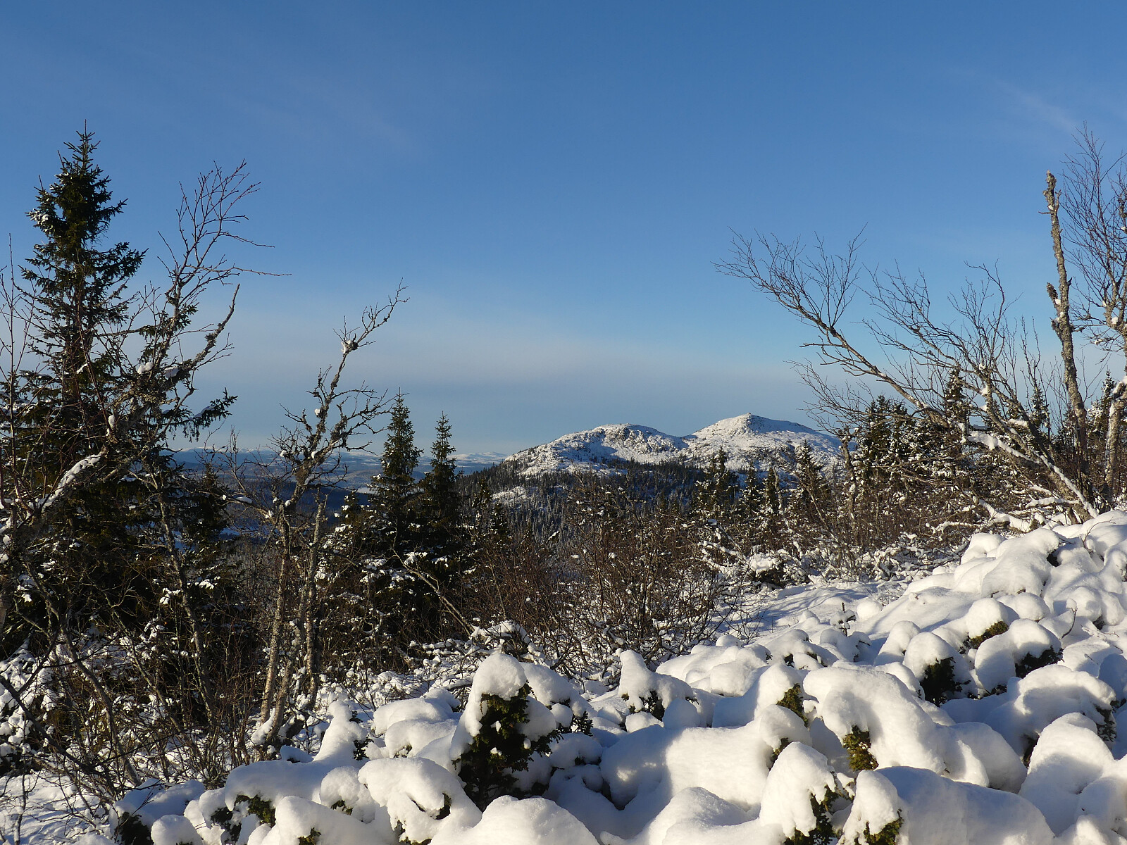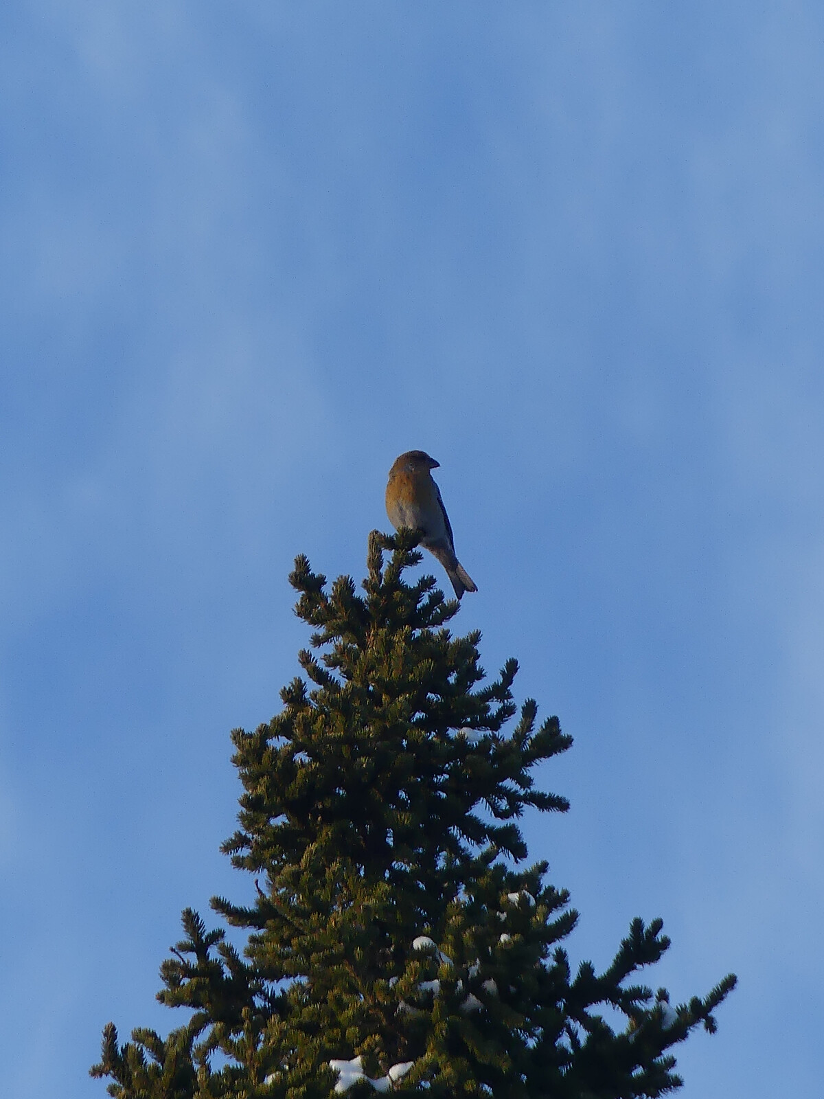 Tur med Balteatus (Håkon Likvern). Hans tur ligger her. Vi parkerer midt mellom dagens to turmål. Først går vi til Vesle Byringen, så til Høgåsen. Fin-fine forhold i dag; 10-12 minusgrader, vindstille og 10 cm nysnø. Tåka ligger tjukk nede i lavlandet, mens her er det bare blå himmel! Det er lite liv i skogen i dag, men noen små flokker med konglebit gjør susen. Vi både ser og hører dem flere steder på turen.