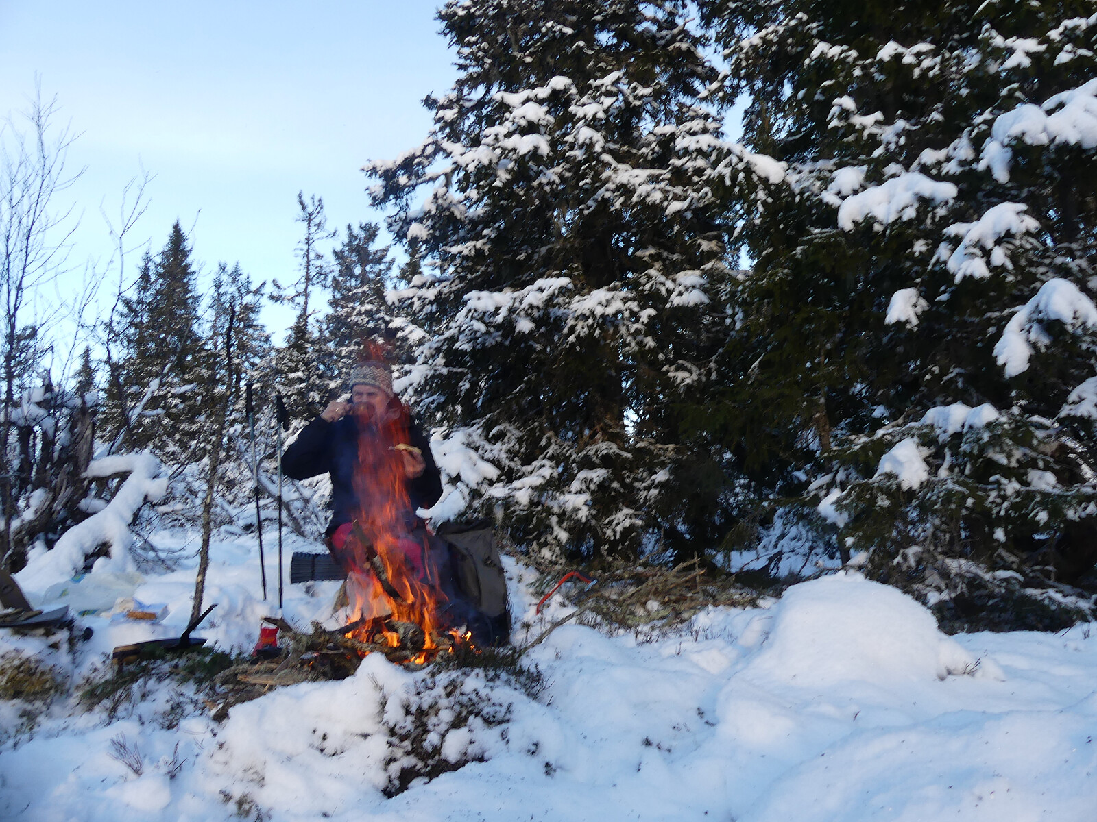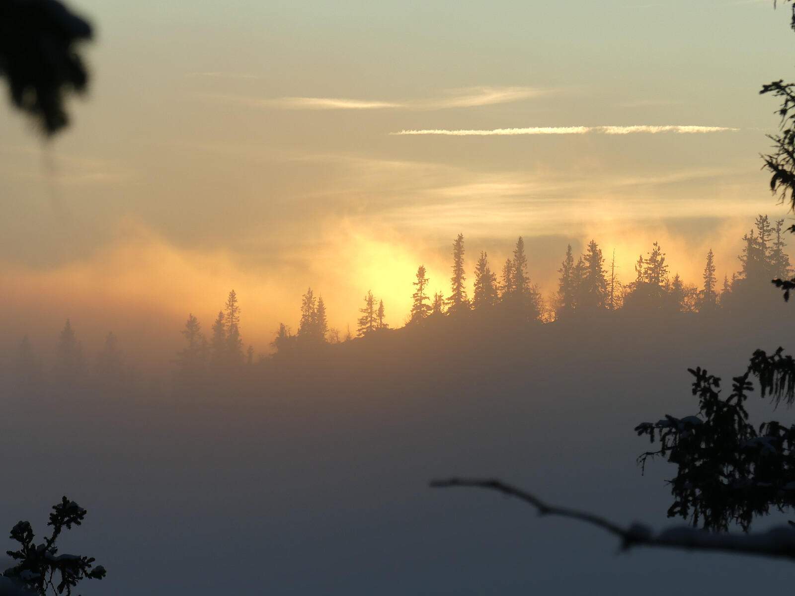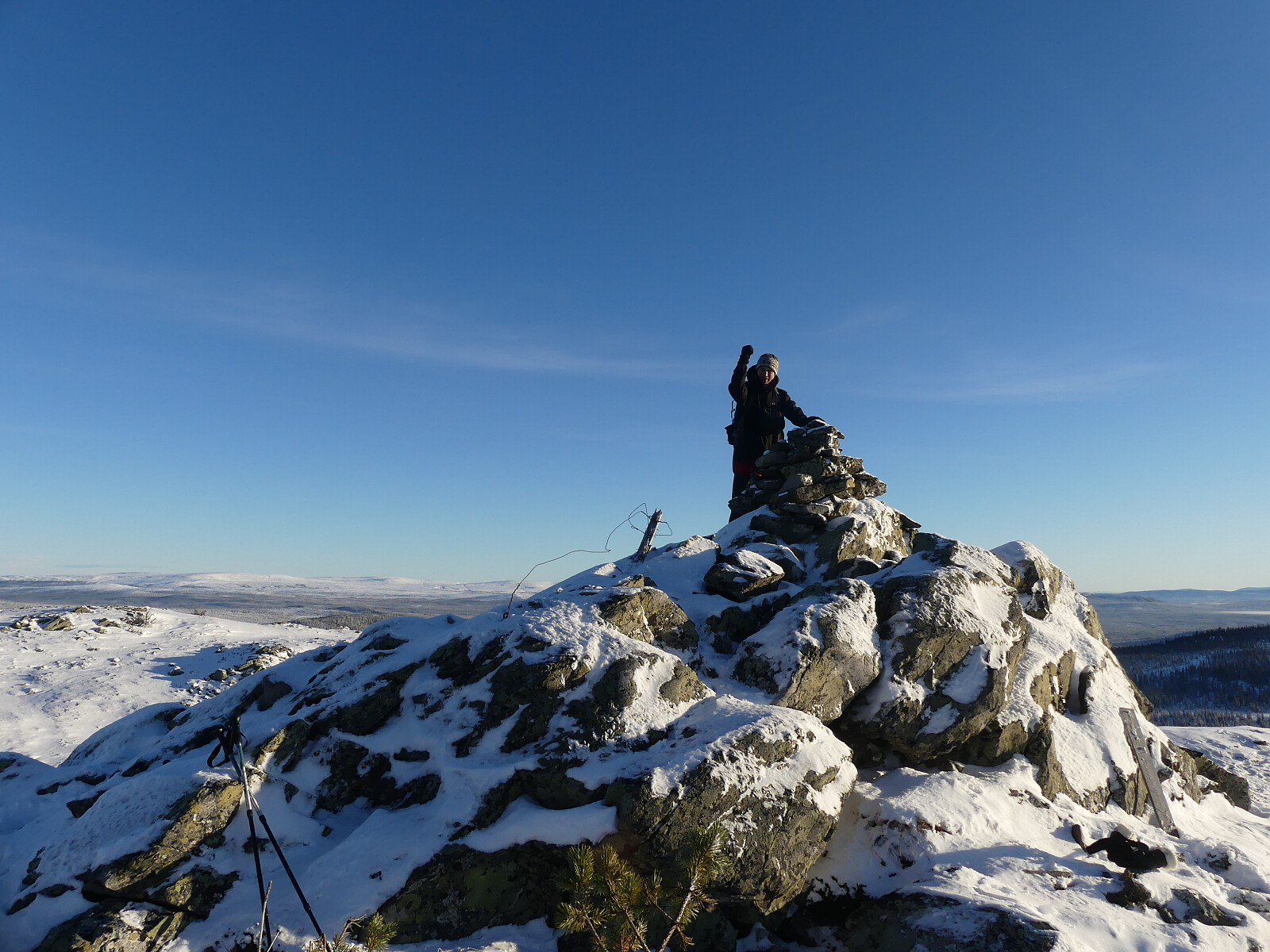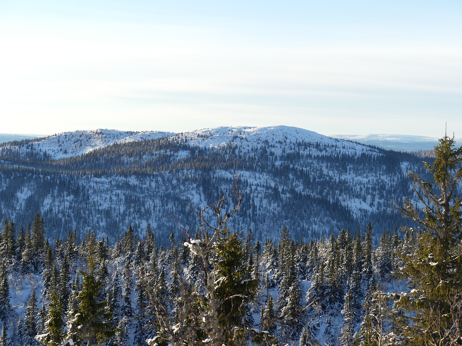 Tur med Balteatus (Håkon Likvern). Hans tur ligger her. Vi parkerer midt mellom dagens to turmål. Først går vi til Vesle Byringen, så til Høgåsen. Fin-fine forhold i dag; 10-12 minusgrader, vindstille og 10 cm nysnø. Tåka ligger tjukk nede i lavlandet, mens her er det bare blå himmel! Det er lite liv i skogen i dag, men noen små flokker med konglebit gjør susen. Vi både ser og hører dem flere steder på turen.