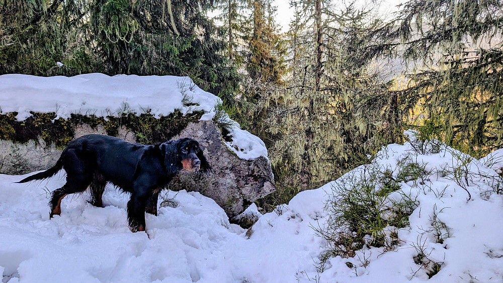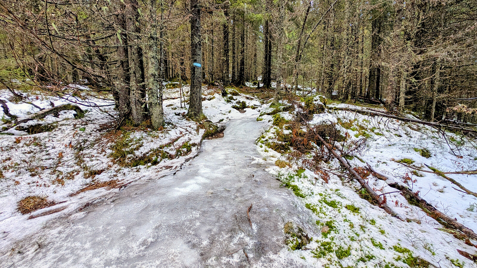 Mildværet kom for fullt og ødela en ellers fin dag værmessig på Åsen. Mye av snøen hadde smeltet i løpet av natta. Håpte i går på nok en dag med masse snø på trærne og fine vinterfotos. Det ble det ikke. Gikk med brodder fra bilen og hele turen idag. Tur alene med Embla.