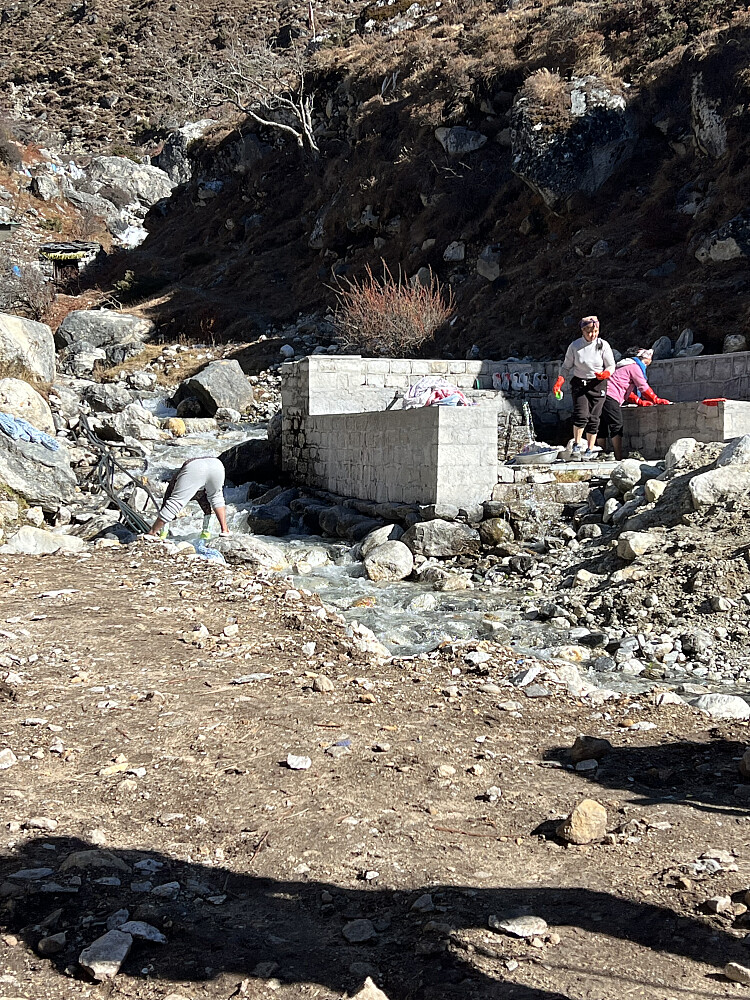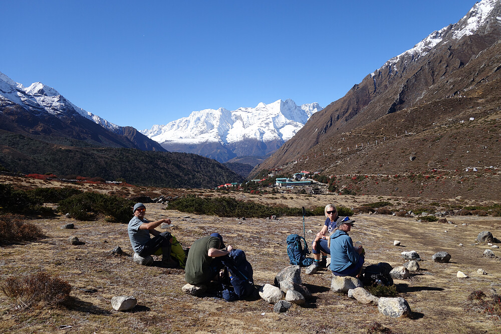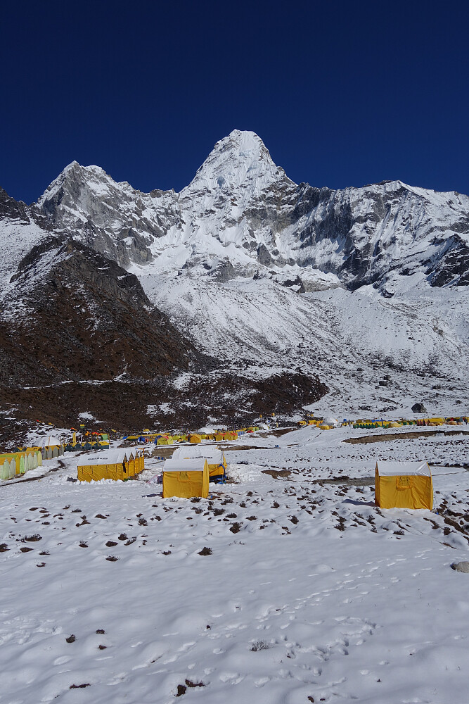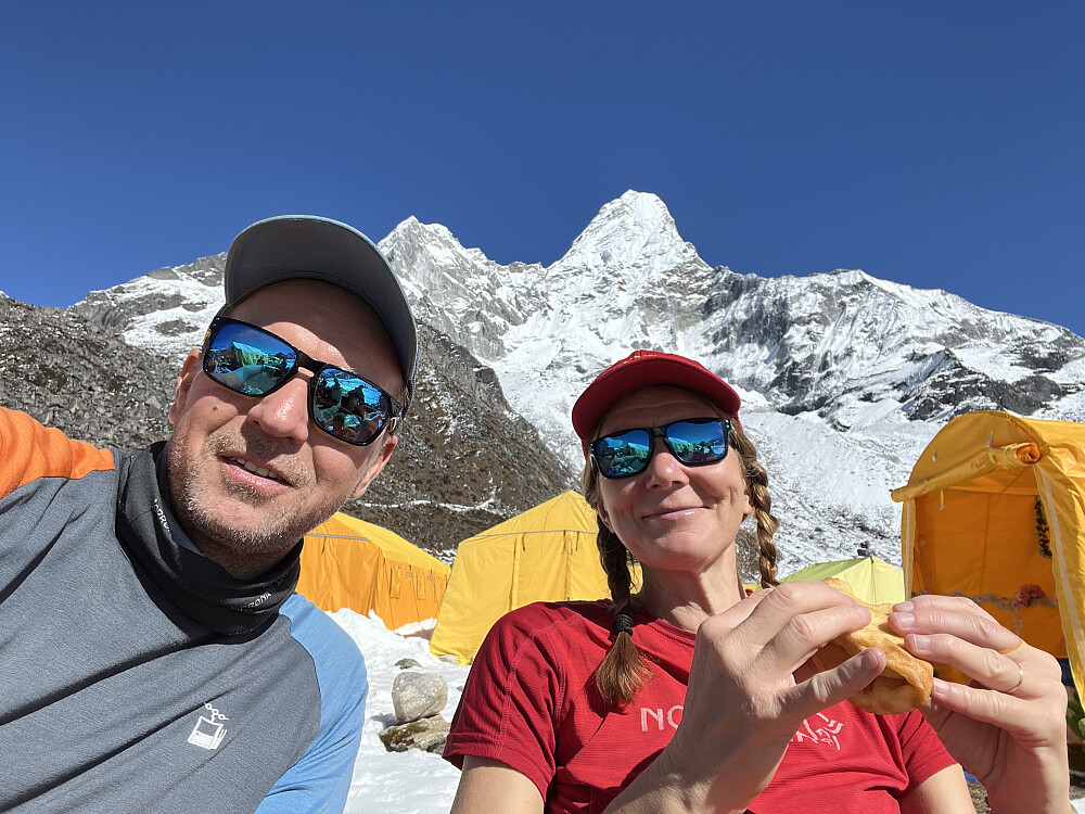 Våknet til strålende sol i dag også. Et av turens høgdepunkt på programmet. Etter frokost og te, rusla vi ned mot elva og opp bakkene mot Ama Dablam Basecamp. Sakte men sikkert. Magisk utsikt samme hvilken veg vi så - hele vegen opp. Og for en opplevelse å komme i campen! Masse telt, men lite folk - de var nok på tur videre oppover til de resterende campene. Fikk servert te, og kosa oss i sola. Rene påskestemningen! Etter en runde i campen, rusla vi ned og tilbake til Pangboche. For en dag!!
