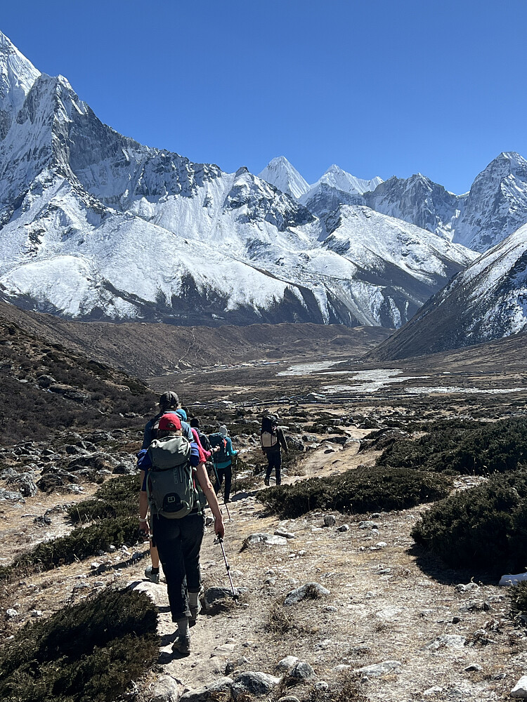 Form: Sekretæren hoster fortsatt mye, men det går lettere framover i tjukkere luft. Skuffelsen overvåkes måtte snu på Loboche sitter fortsatt i kroppen, men lettere i dag. Turplanleggeren er fortsatt i strålende form.