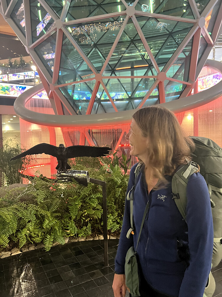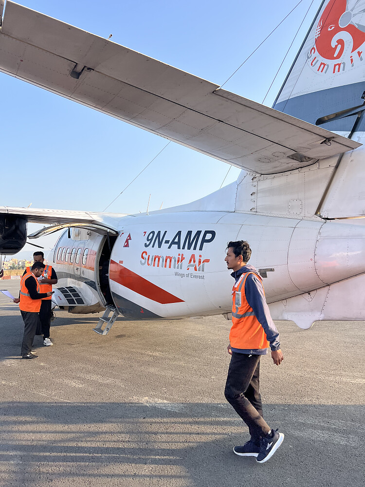 Flyet fra Lukla til Katmandu skulle gå kl 8 om morgenen. Det viste seg - etter 6 timer med venting og mye informasjon frem og tilbake - at flyet vårt måtte repareres. Reparatør ble flydd inn fra Katmandu. Han skrudde flyet sammen, og etter 8 timer med venting ble det vår tur. Veldig spente på flyturen ut på en flystripe med 15 graders helning og nyfikset fly... Flyturen gikk fint og reparatøren satt ved siden av oss og sovnet så da var det greit..