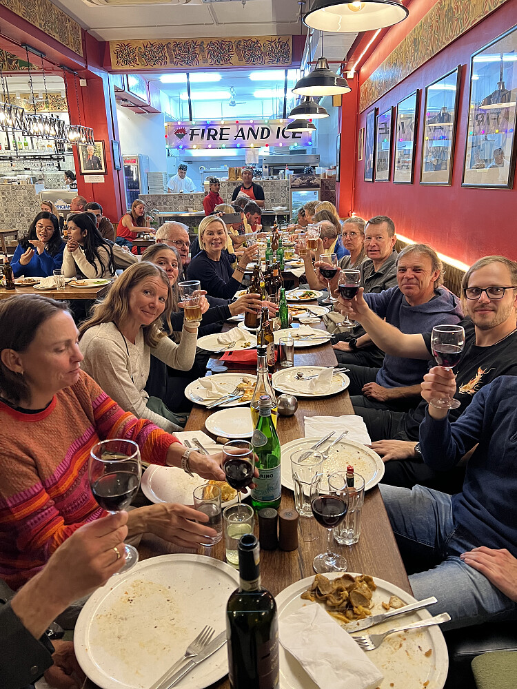 Siste kveld med gjengen på Fire and Ice - med ekte Italiensk pizza som smakte veldig godt etter å levd på vegetarmat i lang tid. Vi skulle være igjen 5 dager så dette var farvel til gjengen. For en fin gjeng å være på tur med.