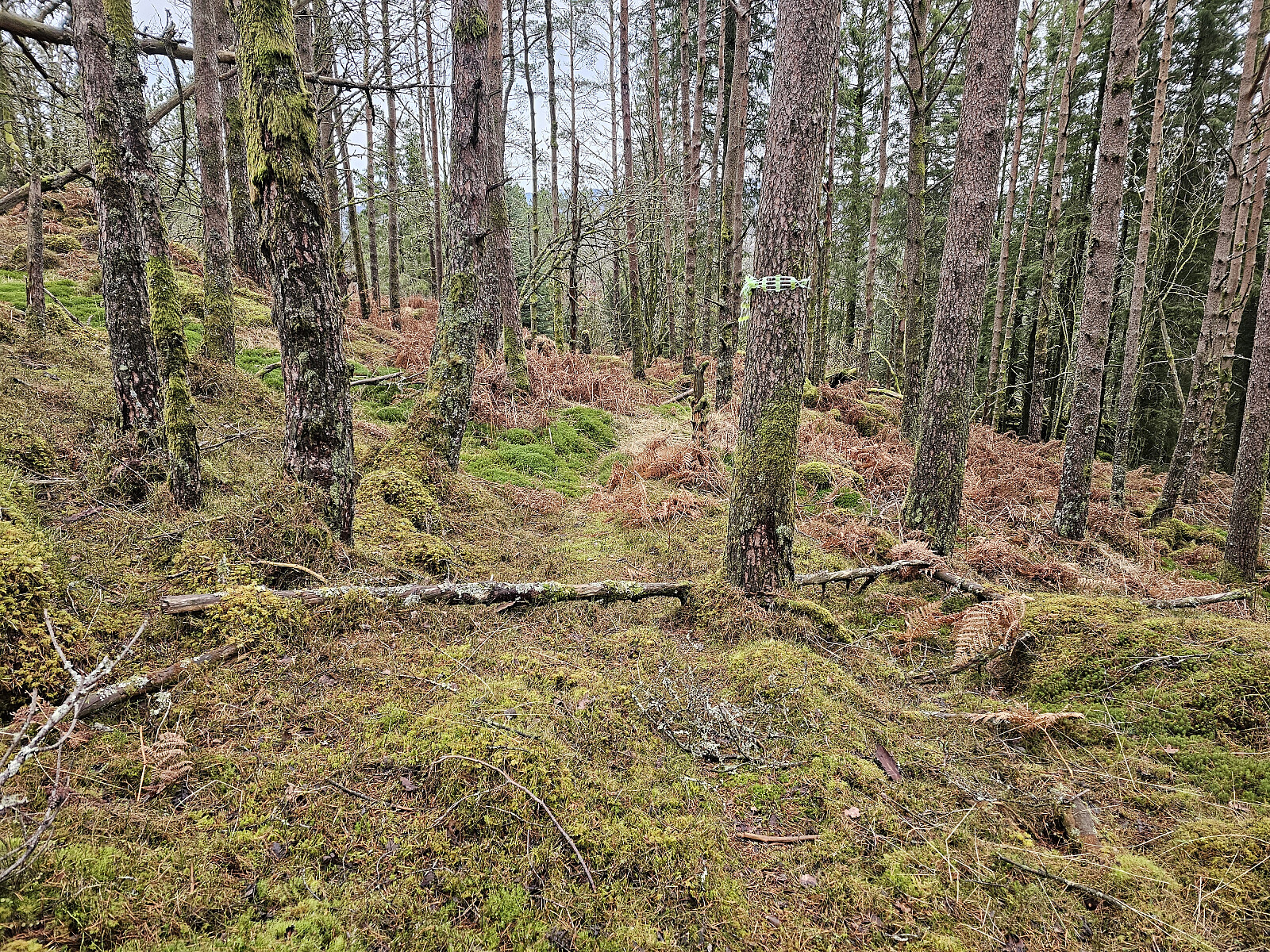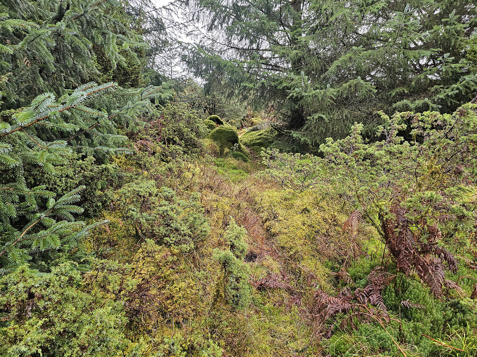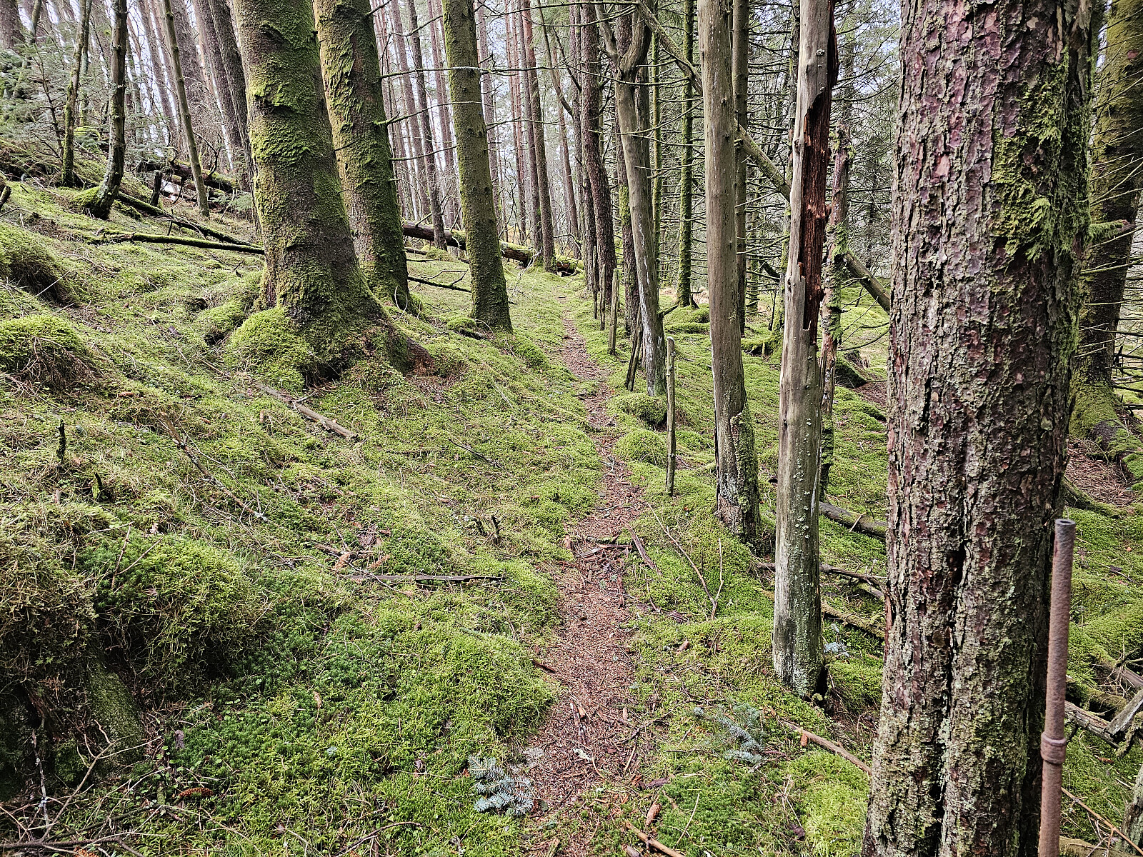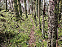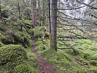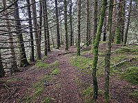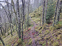 Ned igjen gikk jeg etter kart der det er merket sti på østsiden av toppen. Begynte med et merke på en myr men ingen sti der. Ble litt frem og tilbake til jeg kom inn på en sti som holdt tilnærmet traseen der det er avmerket sti på kart. Rotet litt for å holde meg til stien nedover, var inne på god sti andre steder nesten fraværende.