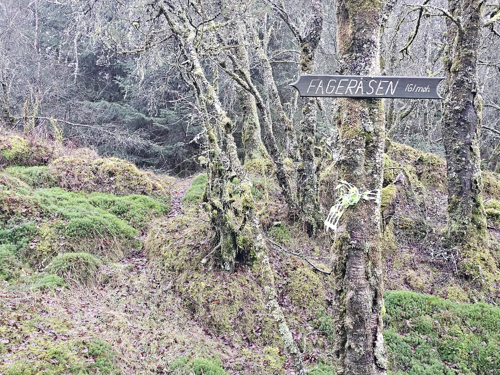 Parkerte på parkeringsplassen til Smineset Friluftsområde på Litlebergen. Turmålet var Fageråsen, en mindre skogtopp sydvest for Litlebergen. En grønn PB. topp med et besøk. Er tegnet inn sti på kart fra Litlebergen opp skogsveien og rundt toppen. Skogsveien ble raskt til en sti som jeg fulgte oppover på vestsiden av toppen. Bra sti for det meste men noen partier slet jeg litt for å følge stien. Rett syd for toppen er det et turskilt som viser svak sti opp siste stykket. Mye tett skog, men toppen er åpent med en bergknaus med trig. p. og navneskilt.