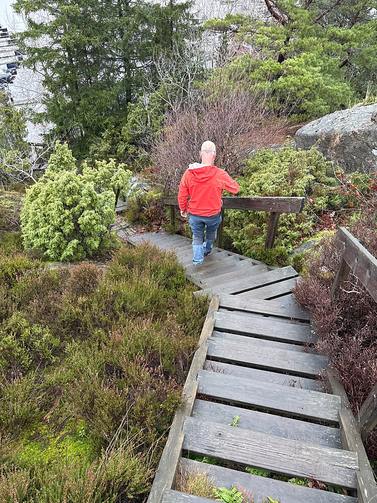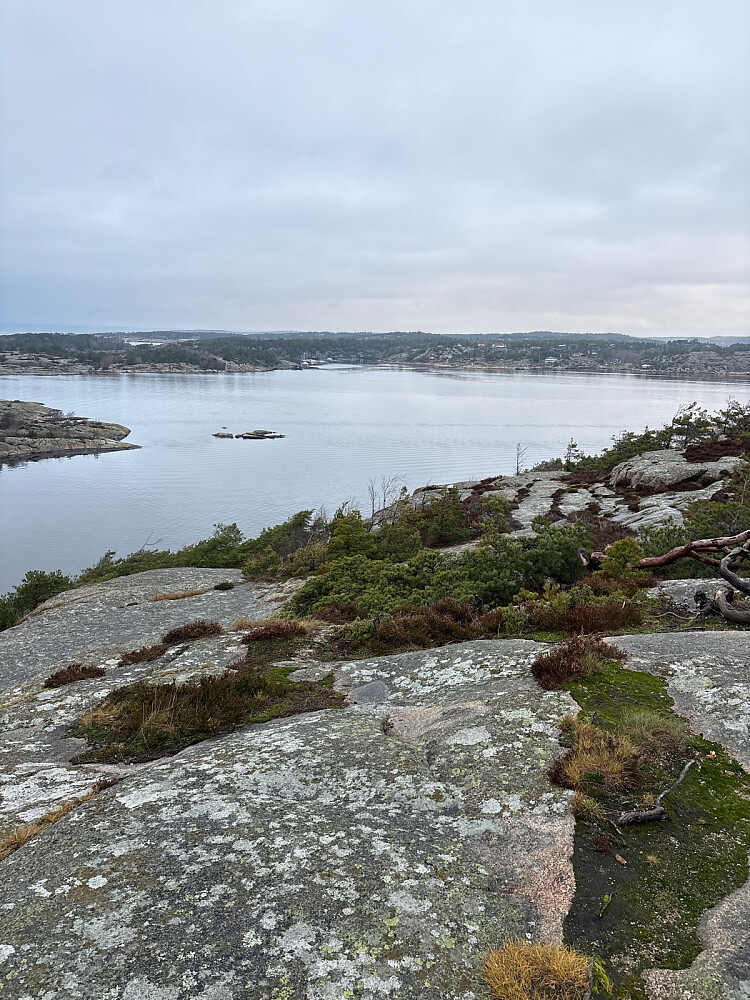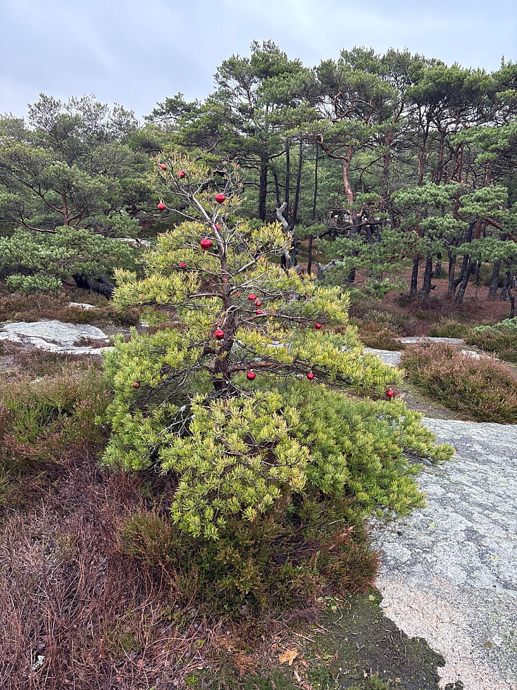 Også til denne toppen var det et stykke å kjøre men turen var kort og enkel. Stien tydelig og godt merket. Fin utsikt utover sjøen og mot Hankø. Noen hadde også tatt seg bryet med å pynte to trær med julekuler.