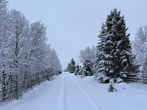 Ulempen var at veien ikke var brøytet. Utenom de 30-40 centimeterne med snø var det kun et par dype traktorspor fra noen dager tidligere som viste på veien. Jeg fant frem trugene og la i vei innover mot Raudhaugen. Traktorsporene kunne følges til veis ende der hvor traktoren hadde snudd, og videre oppover ble det ganske utfordrende i lyngen og den løse snøen. Det ble heldigvis litt bedre etter hvert som jeg nærmet meg toppen, og snart kunne jeg puste ut ved siden av stolpen som markerte toppen. Det var også satt opp en krakk der oppe. Sannsynligvis ville det nok vært brukbar utsikt også hvis det ikke hadde vært så tett tåke.