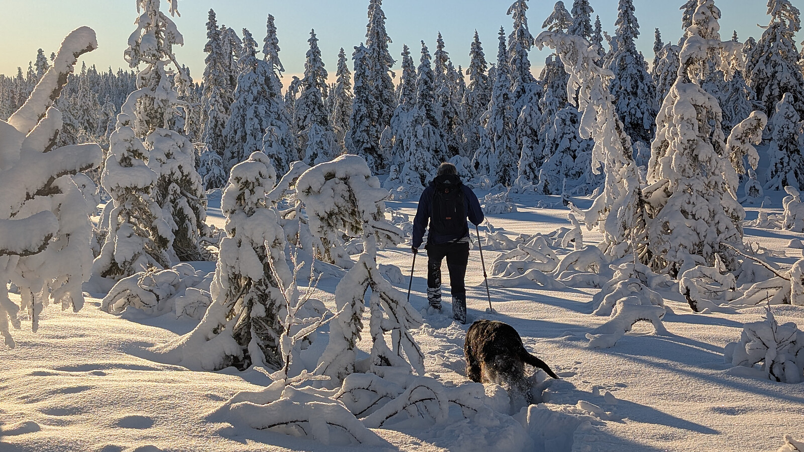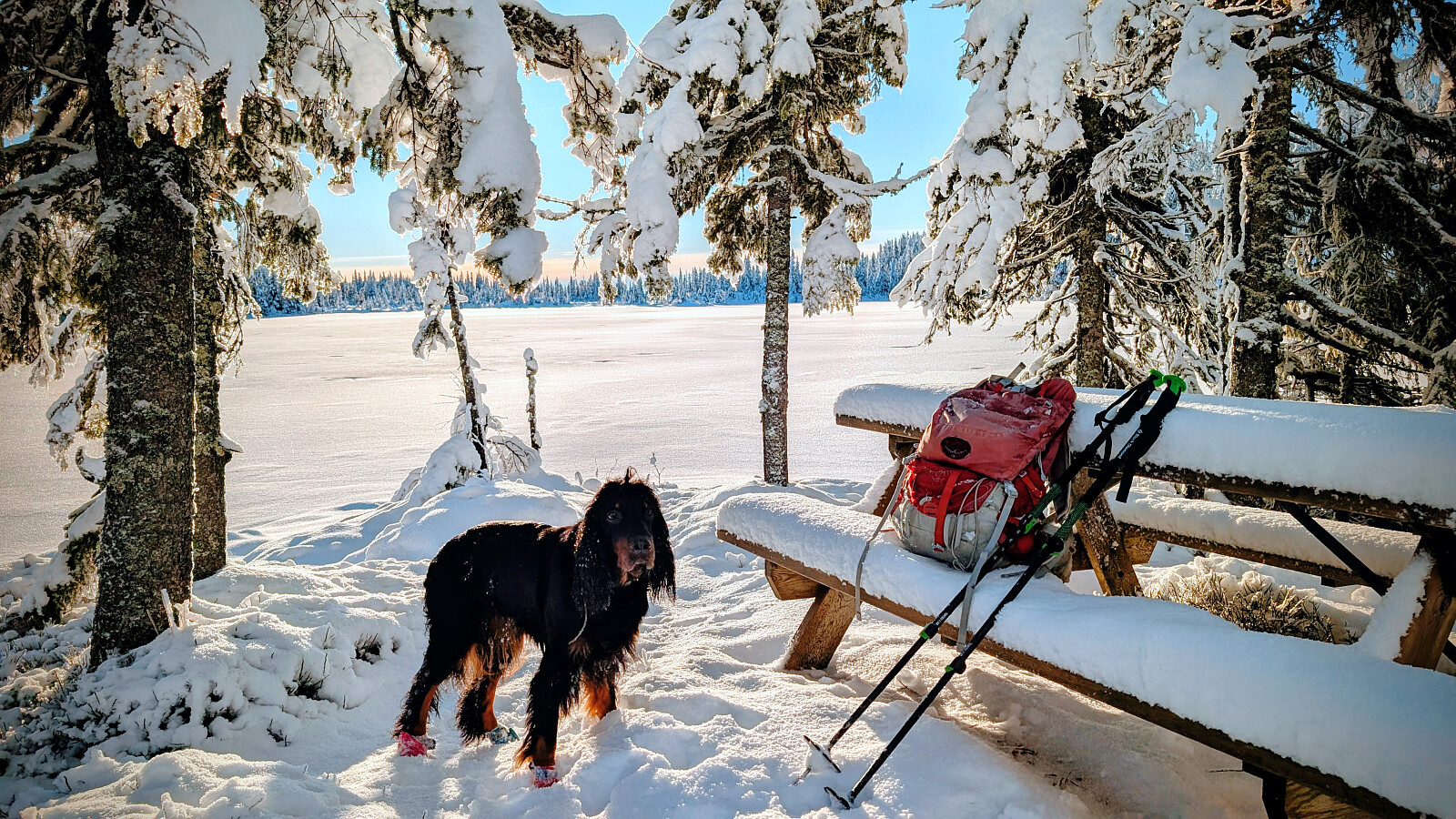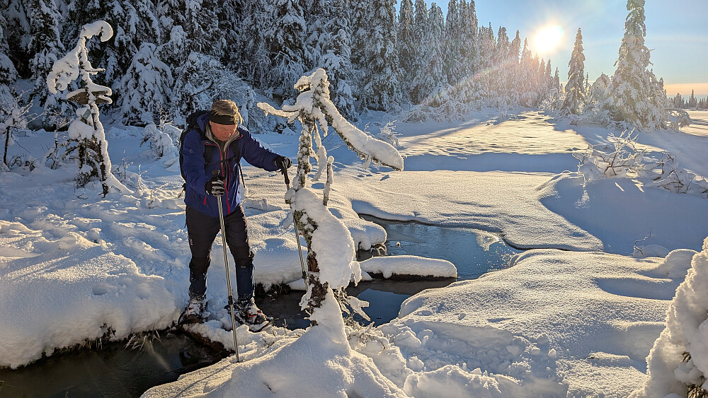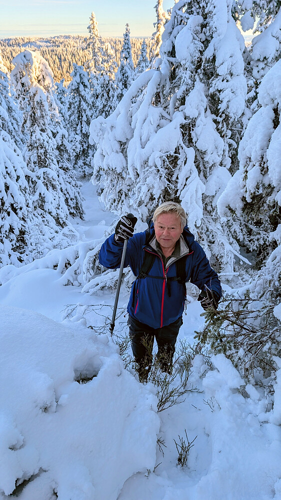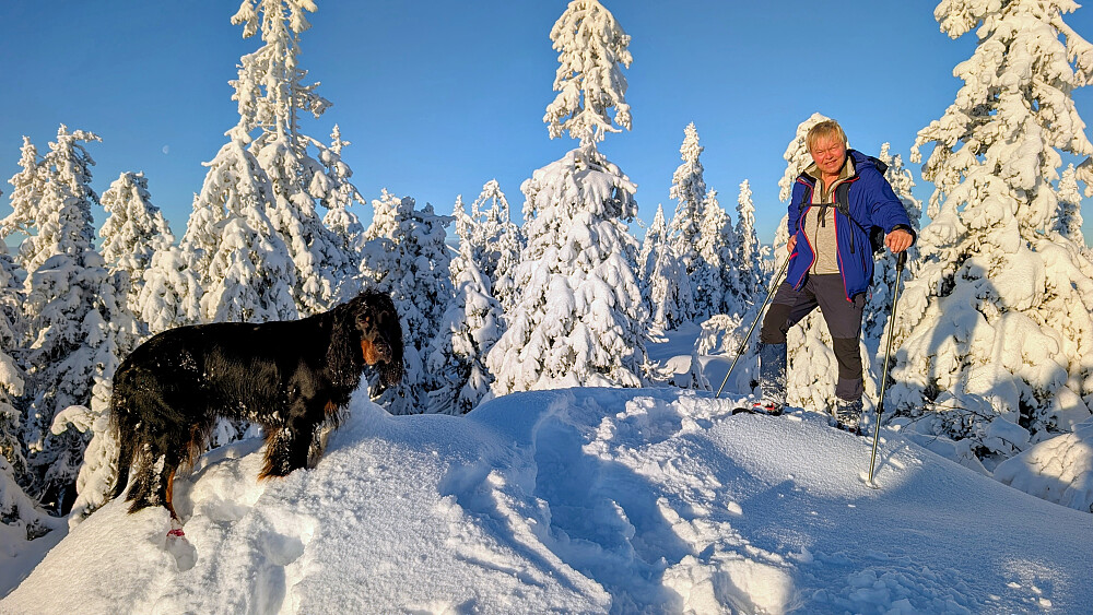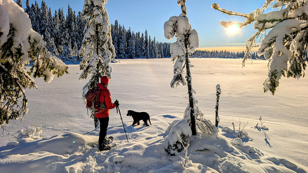 Idag ble det bruk for truger. Tok de minste trugene i dag (24")men burde nok tatt 30". Jeg gikk og tråkket spor hele turen og det var nok mellom 30-50 cm snø på store deler av runden. Mest snø der det var bratteste mot Fugletjernshøgda og Høgbrenna. En super tur ble det og god trening. Tøft for Embla i dag i den dype snøen. Gikk ikke over isen på Vestre Ormtjern pga overvann og dårlig is helt inne ved land. Tur med Ståle og Embla.