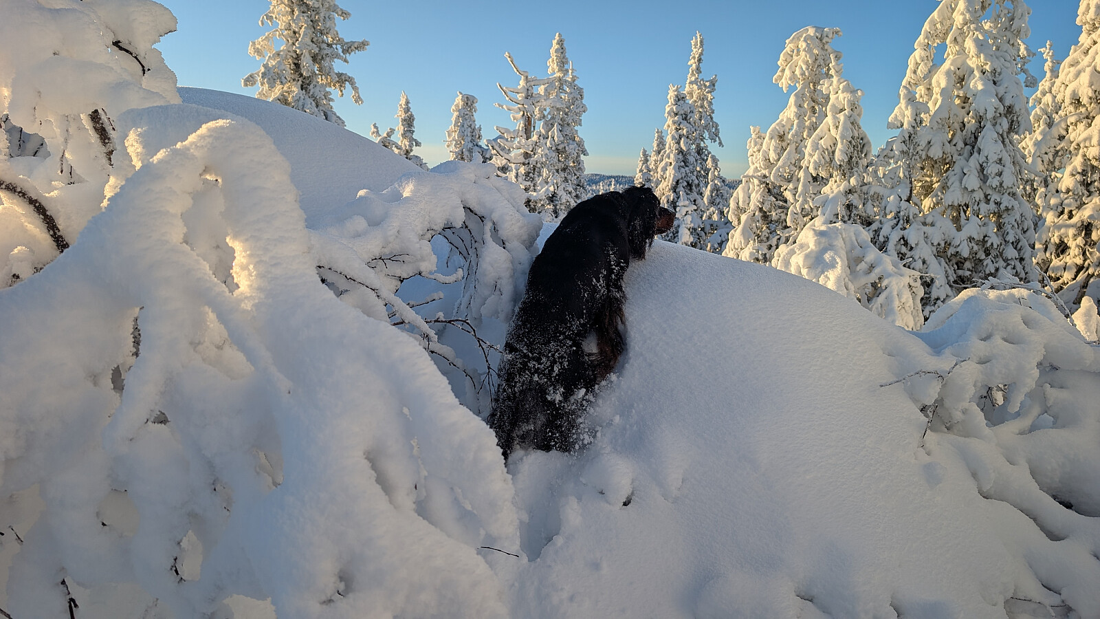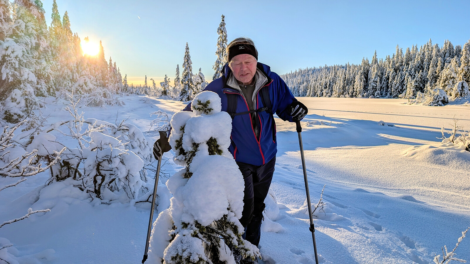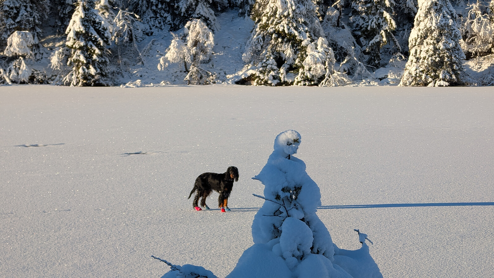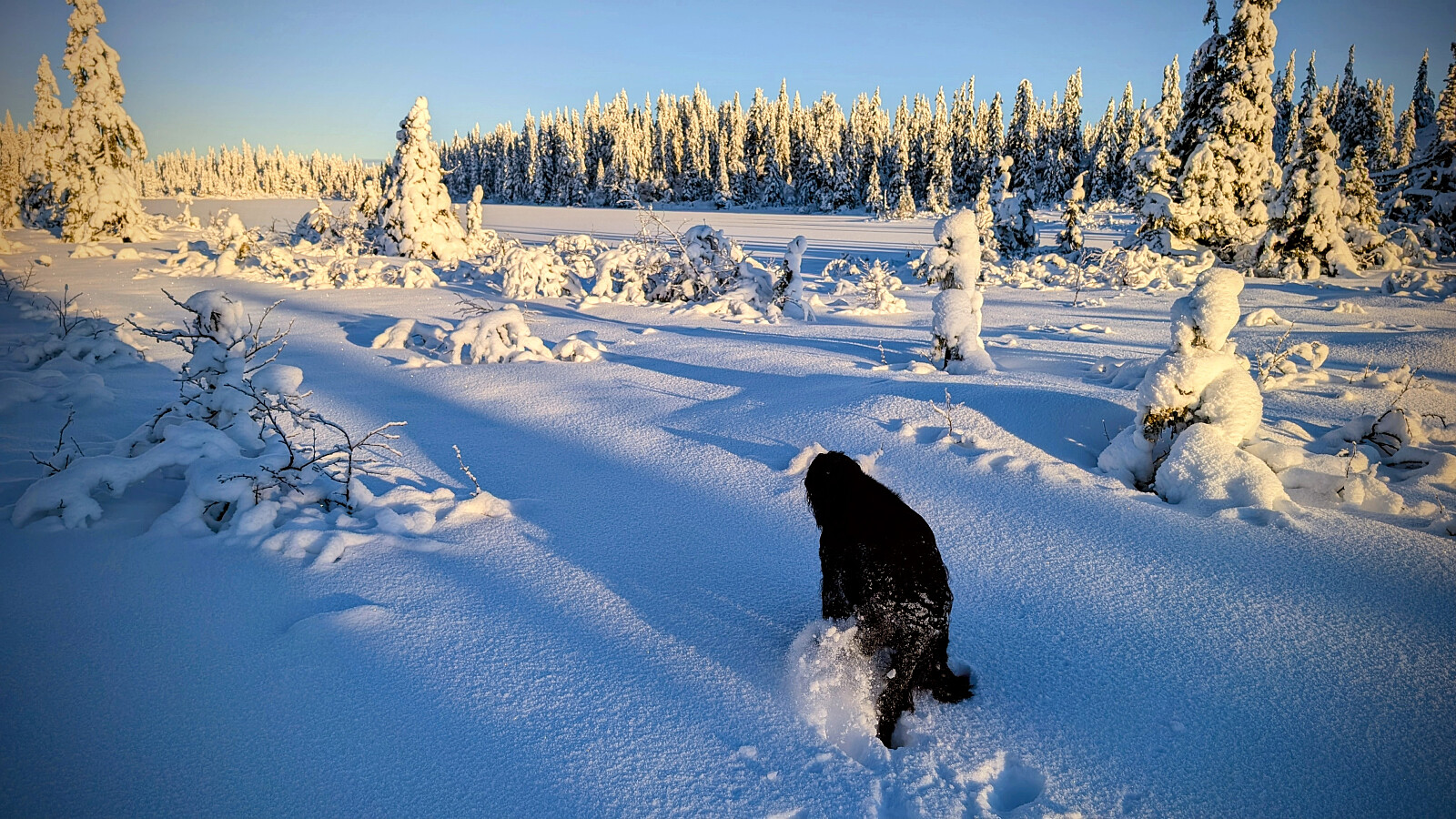 Idag ble det bruk for truger. Tok de minste trugene i dag (24")men burde nok tatt 30". Jeg gikk og tråkket spor hele turen og det var nok mellom 30-50 cm snø på store deler av runden. Mest snø der det var bratteste mot Fugletjernshøgda og Høgbrenna. En super tur ble det og god trening. Tøft for Embla i dag i den dype snøen. Gikk ikke over isen på Vestre Ormtjern pga overvann og dårlig is helt inne ved land. Tur med Ståle og Embla.