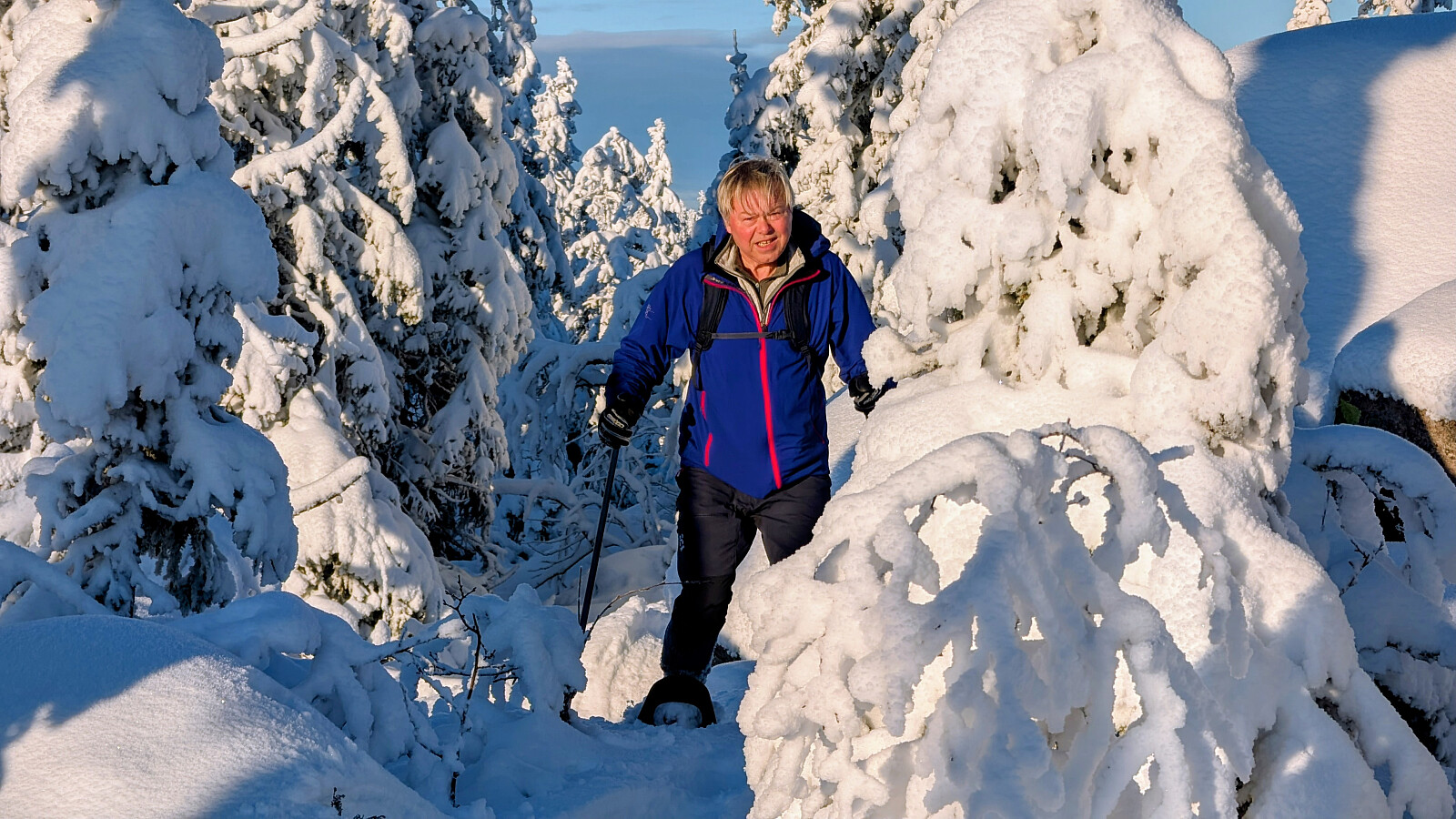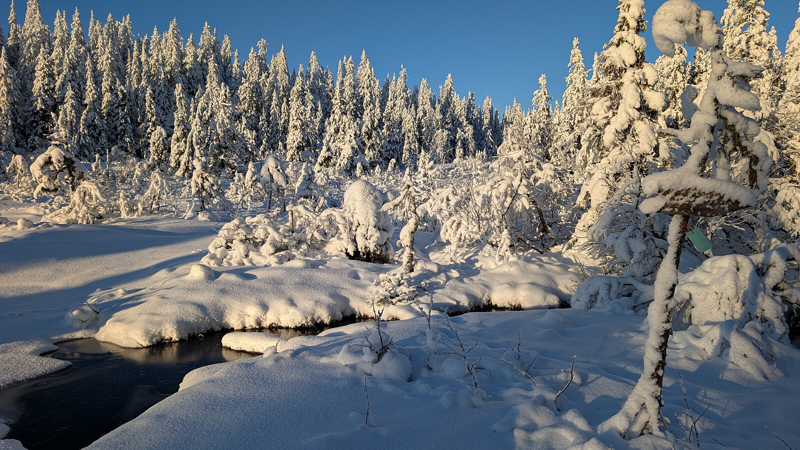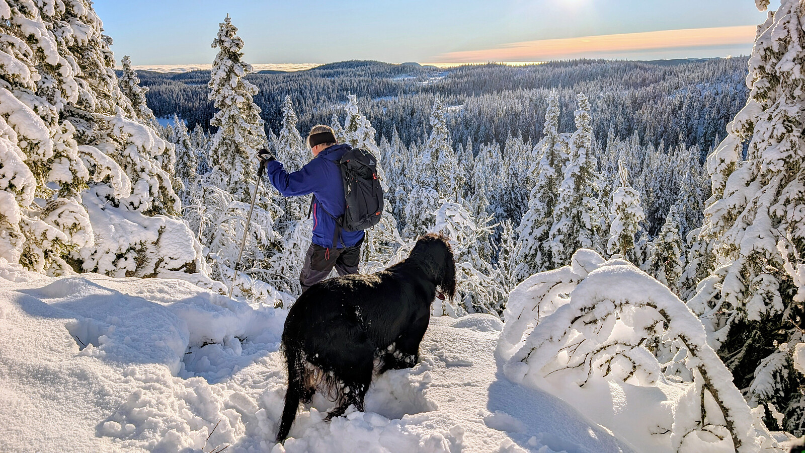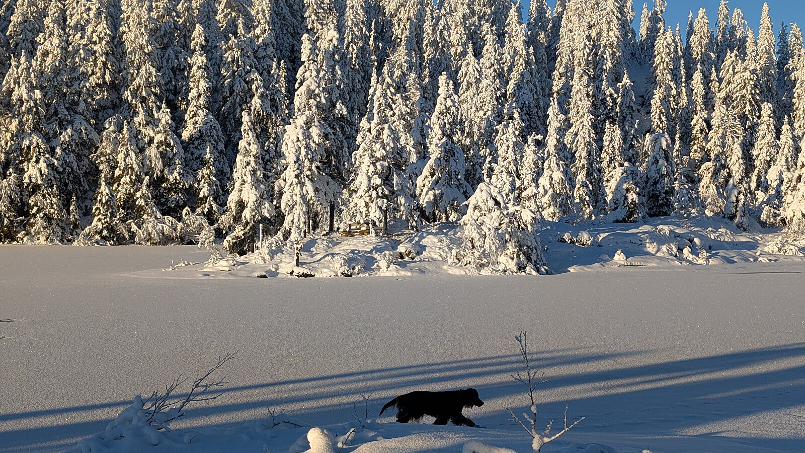 Idag ble det bruk for truger. Tok de minste trugene i dag (24")men burde nok tatt 30". Jeg gikk og tråkket spor hele turen og det var nok mellom 30-50 cm snø på store deler av runden. Mest snø der det var bratteste mot Fugletjernshøgda og Høgbrenna. En super tur ble det og god trening. Tøft for Embla i dag i den dype snøen. Gikk ikke over isen på Vestre Ormtjern pga overvann og dårlig is helt inne ved land. Tur med Ståle og Embla.
