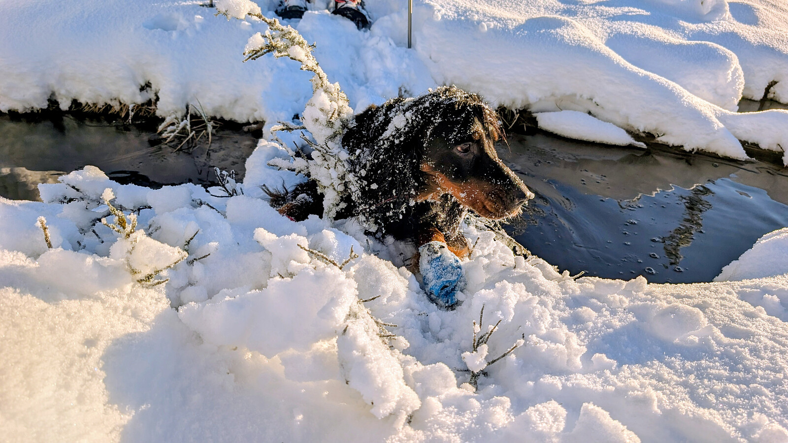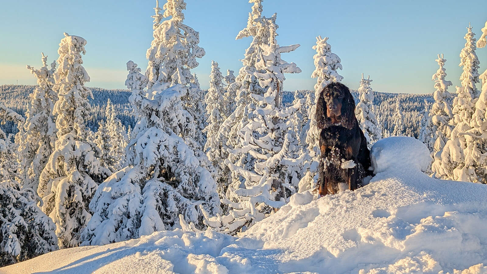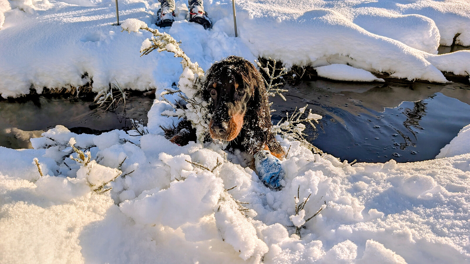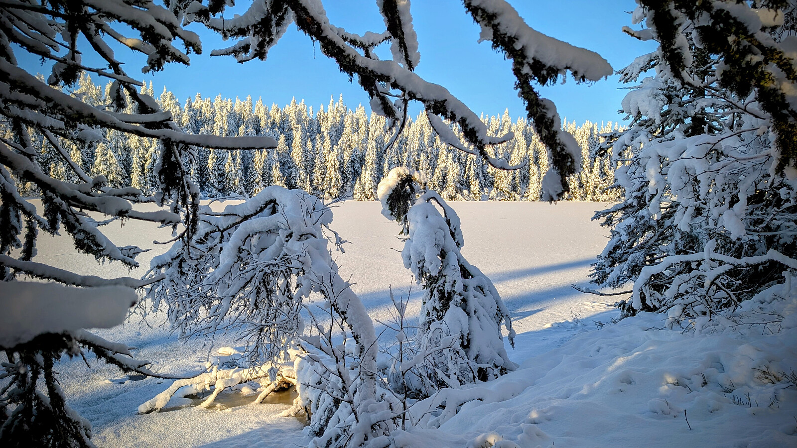 Idag ble det bruk for truger. Tok de minste trugene i dag (24")men burde nok tatt 30". Jeg gikk og tråkket spor hele turen og det var nok mellom 30-50 cm snø på store deler av runden. Mest snø der det var bratteste mot Fugletjernshøgda og Høgbrenna. En super tur ble det og god trening. Tøft for Embla i dag i den dype snøen. Gikk ikke over isen på Vestre Ormtjern pga overvann og dårlig is helt inne ved land. Tur med Ståle og Embla.