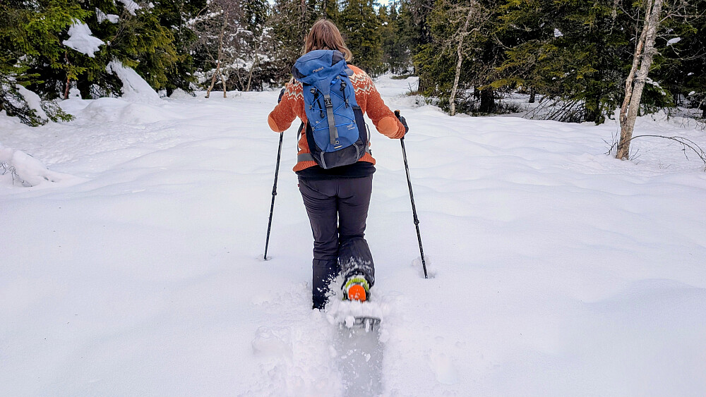 Litt skuffende vær da sola uteble idag. Grei trugetrase fra Oksbakken til Tjuvåskampen. Derfra dypere snø og spesielt tungt sør på ryggen og videre tilbake mot Oksbakken. Var bortom utsikten på "Mariahøgda" før vi gikk mot bilen. En fin tur ble det med Agnete, Irene og Embla.