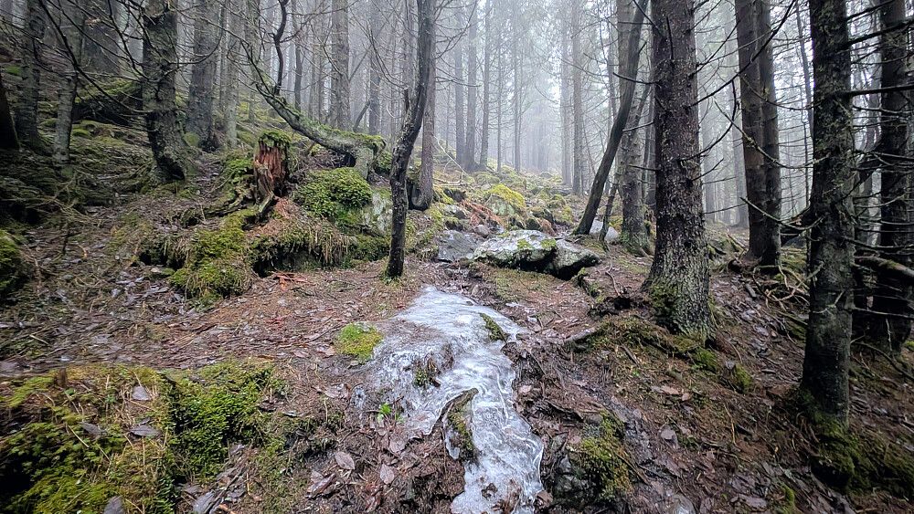 En riktig trist dag. Regn fra start og sludd fra ca 800m. Gikk uten brodder opp normalveien tross noe is her og der. Ca 3cm kram/våt nysnø på toppen. Frisk bris og riktig utrivelig idag, men 400hm er grei trening på ca 2,5 km. Rask tur ned fra Rausteinshytta med brodder...Jens Hansens sti. Tur alene med Embla.