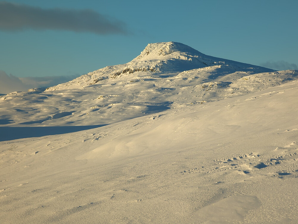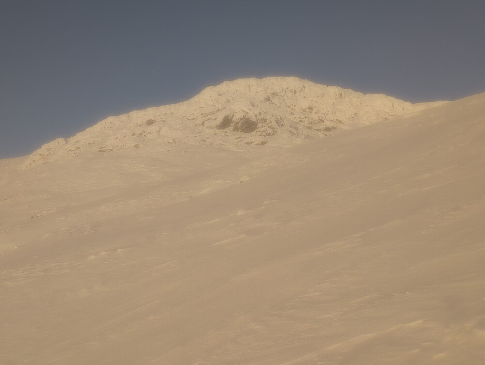 Fjellet godt plastret i snø og veldig lite stein å se.