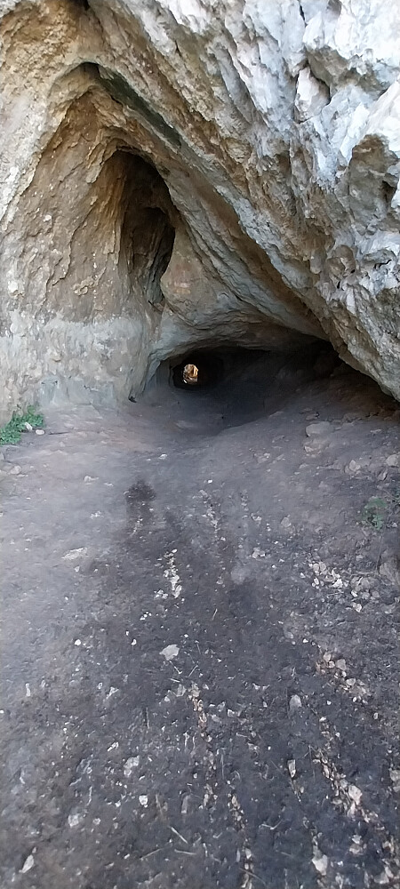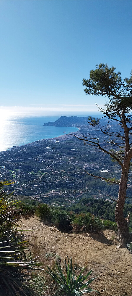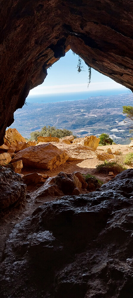 Stien fortsetter inn mot fjellveggen og plutselig dukker det opp en liten huleinngang. Det er lavt under taket i starten så vi må krype innover. Tunellen utvider seg og etter 50 meter åpner det seg en panoramautsikt sørover. Herfra går det merket sti til høyre langs fjellet som ender i stidelt ved parkeringen. Vi fant oss en plass i sola og koste oss der med fantastisk utsikt mot Altea-Albir og Benidorm. Etter 1,5 time krøp vi tilbake gjennom fjellet og fulgte stien ned til parkeringen.