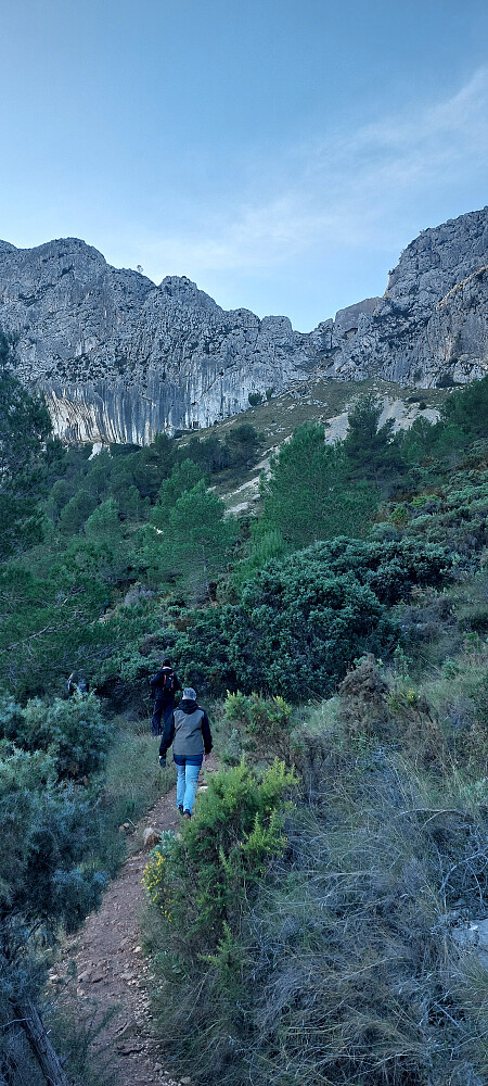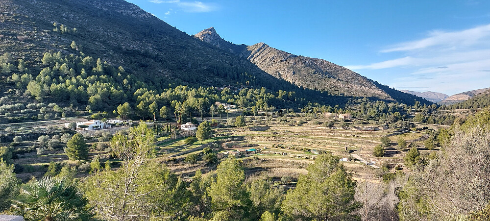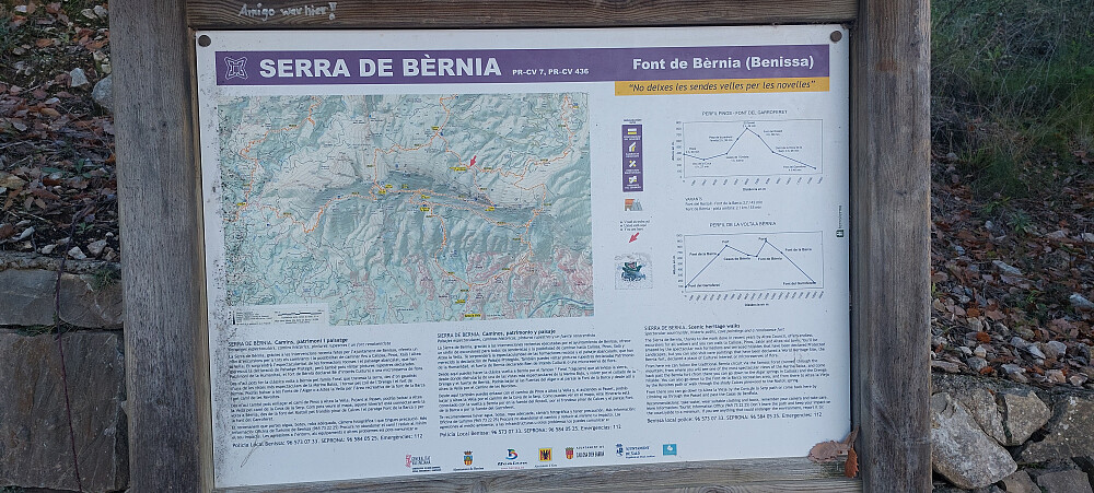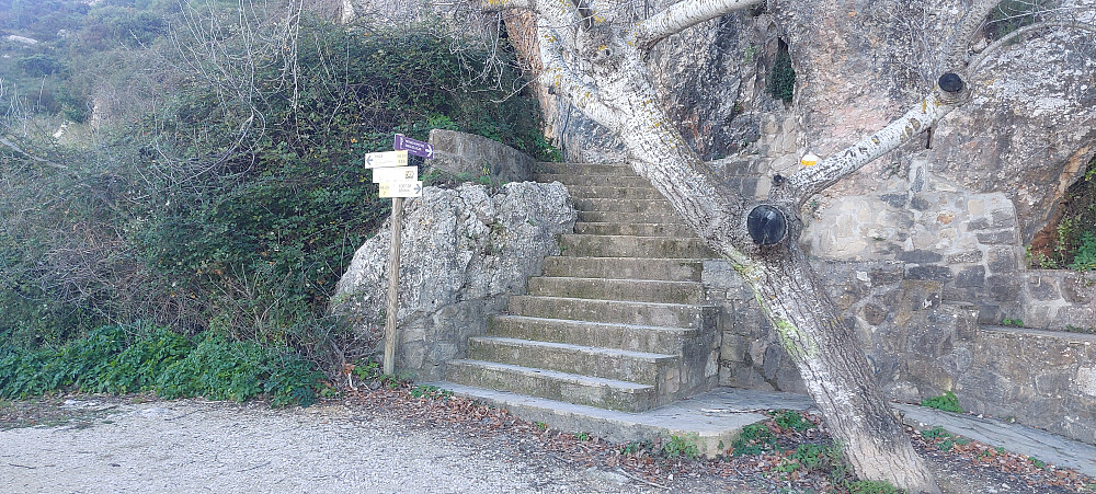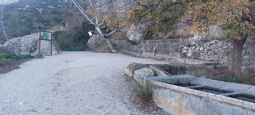 C-749 er asfaltert hele veien. Med mange svinger, og slake stigninger tok den oss i 12,5 kilometer gjennom flott landskap til parkeringen ved foten av Bernia fjellkjeden. Stor parkeringsplass. Tok til venstre på PR-CV-7 i stidele. Stien til høyre vil og ta deg til Forat de Bernia men da på sørsiden av fjellet. Det er litt lenger og du mister den opplevelsen det er å krype gjennom fjellet og møte panoramautsikten på sørsiden. Vi fortsatte på grusvei til venstre. Etter ca 15 minutter kom vi til Font de Bernia. En naturlig vannkilde. Gikk opp trappene og fortsatte på smal sti oppover og bortover. Kom til ett område med steinblokker. For enklest oppgang hold til høyre før du kommer helt inntil.