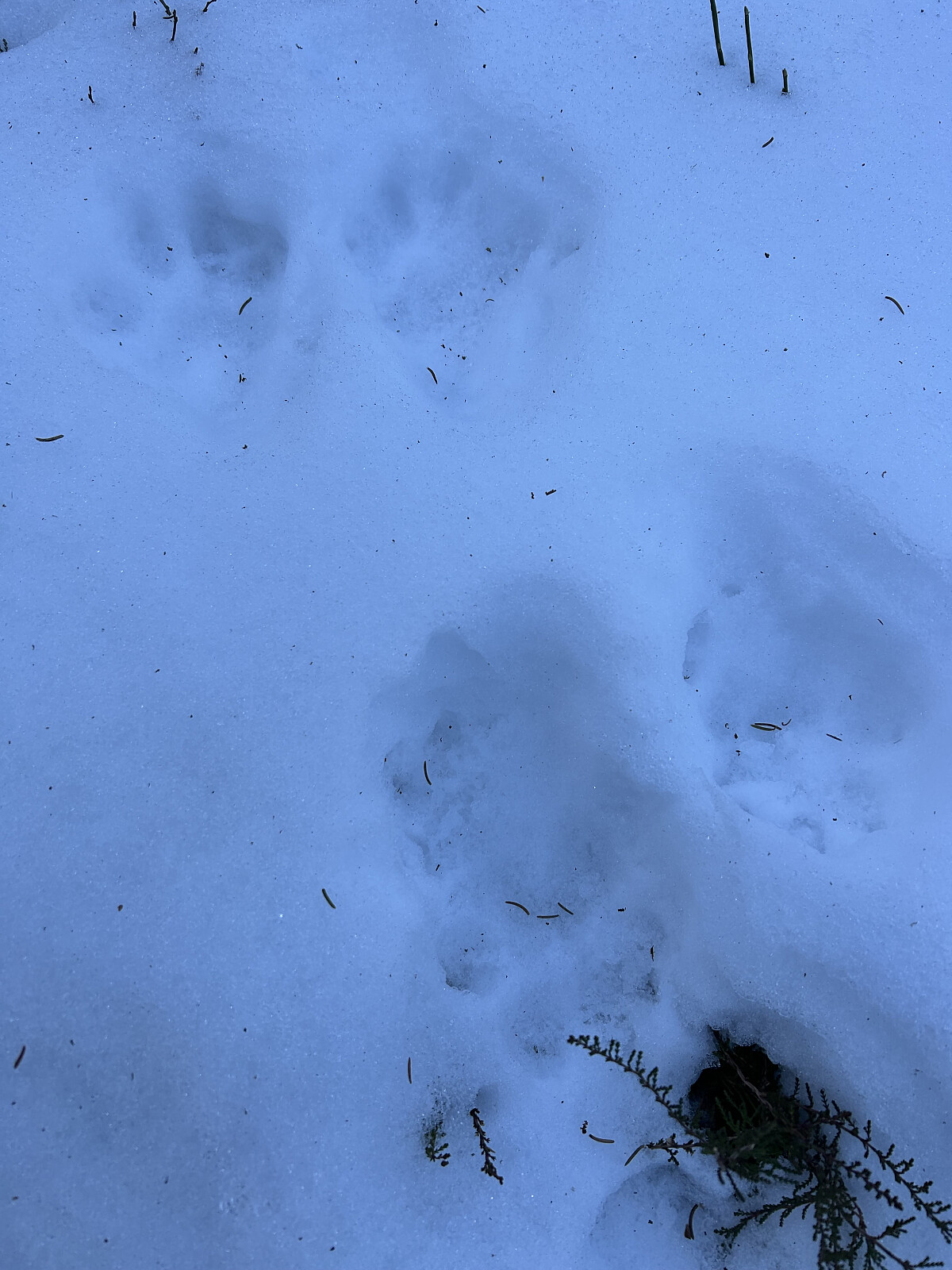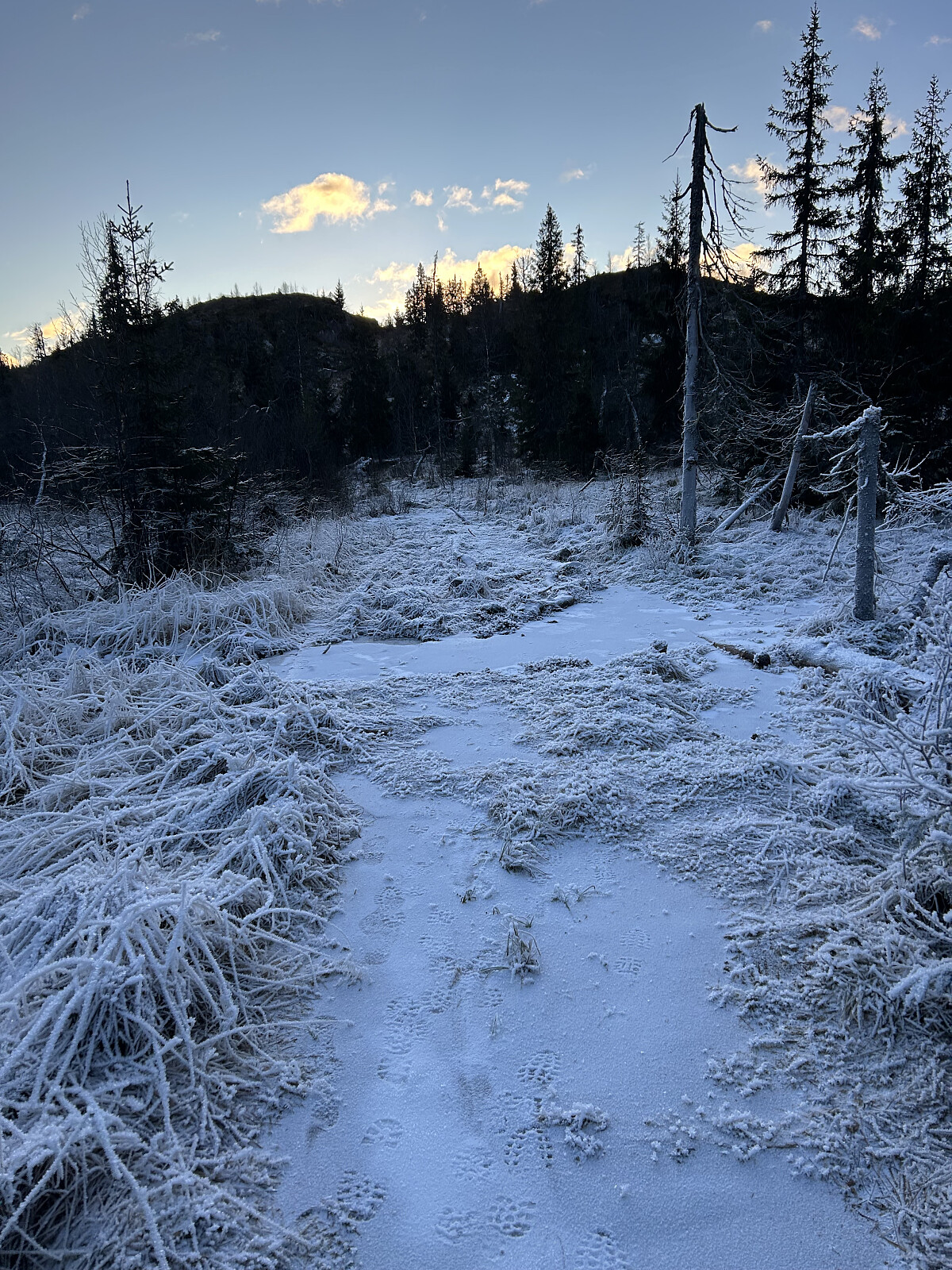 Så var det bare å ta på seg støvlene med “Crampons” brodder og traske oppover. Det var mye is, lite snø, og en del dyrespor. Denne gangen fikk jeg se både elg- og gaupespor, som var både spennende og gøy! Jeg rapporterte gaupesporene til forskerne via SKANDobs-appen, noe jeg alltid gjør når jeg er ute på arbeidsoppdrag i skogen.