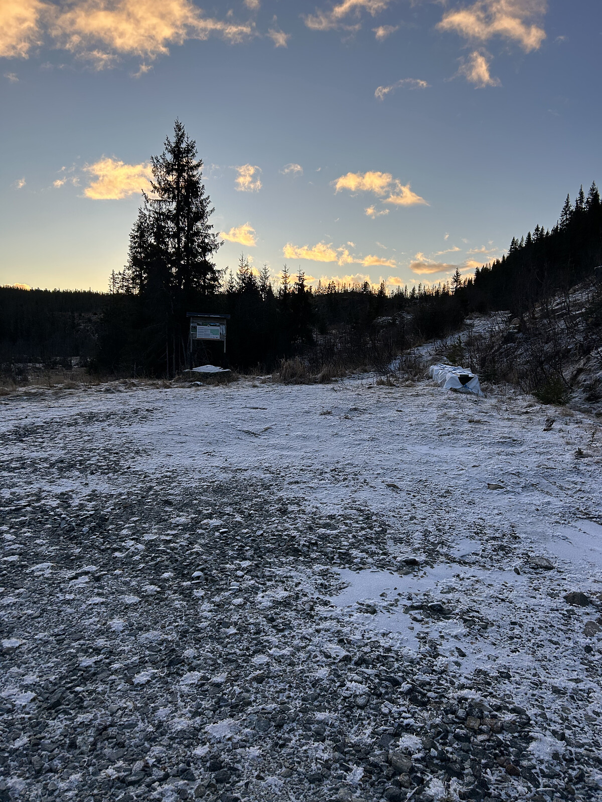 Da jeg kom til en liten åpningsparkering rett før en som drev med trevedsanking og skogsarbeid, snudde jeg og parkerte. Jeg tenkte at det var en god idé, for det viste seg at det var omtrent 700 meter fra Svartjern parkering, og veien ca. 100 meter lenger frem var dekket av is.