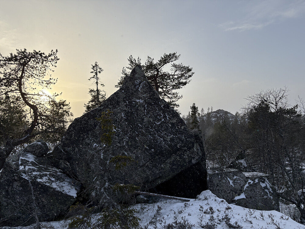 Fra Krokvannet bar det videre innover i terrenget. Først en tur innom Tindkjerka - spesiell steinformasjon og kanskje det nærmeste man kommer en pinakkel på Holtefjell. Kløyv opp, overraskende krevende på dagens forhold. Anslår faktisk en grad 2 altså og du vil virkelig ikke ramle ned. Den er vond.