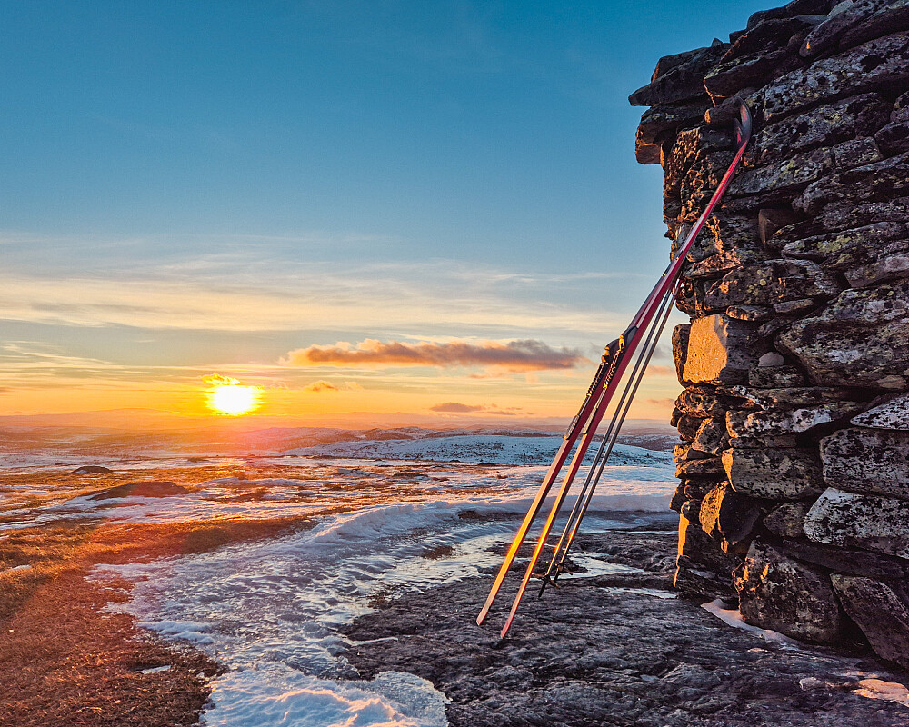 Vinden var kraftig, så hetta ble snurpet godt igjen. På toppen blåste det skikkelig, men den store varden på Dyna leverte som alltid – med god ly på én eller annen side. Og akkurat da jeg nådde toppen, like før kl. 15, brøt sola gjennom og leverte en ordentlig romjulssolnedgang.