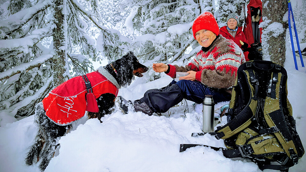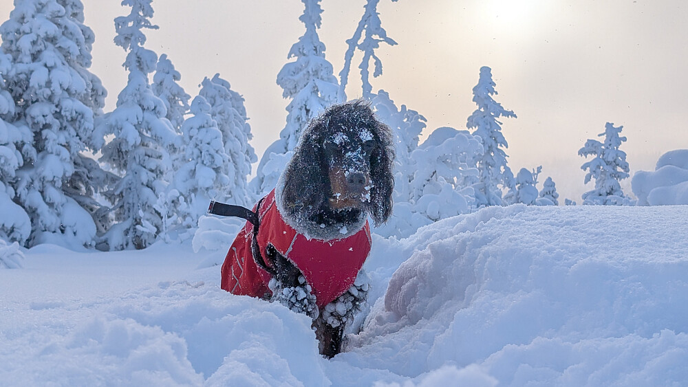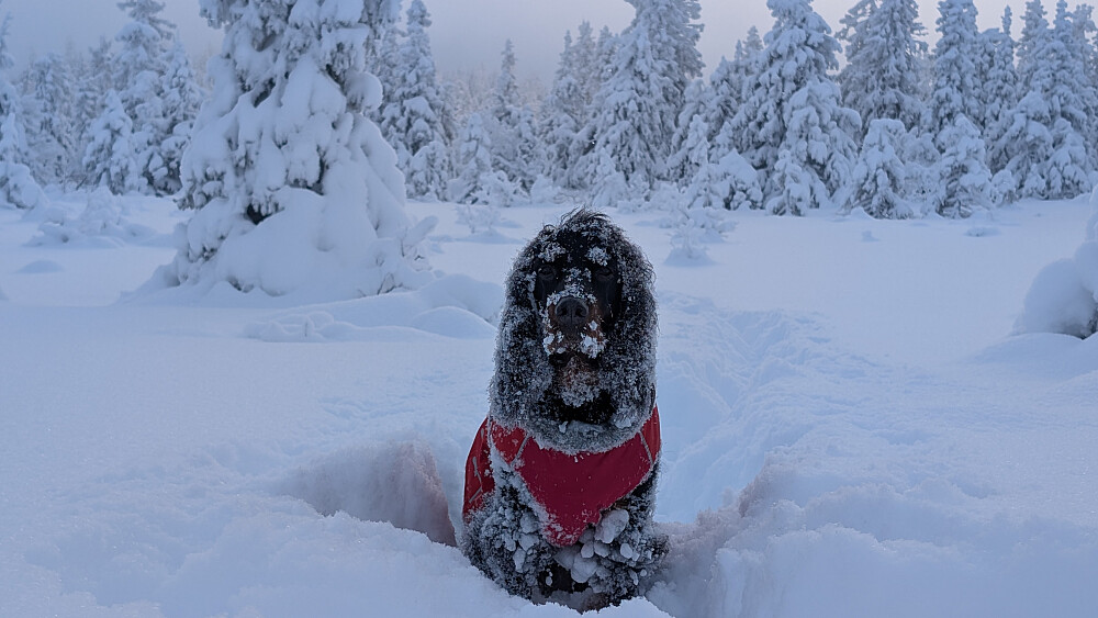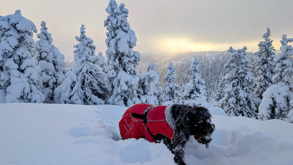 Slang meg med Åskopgjengen sin onsdagstur. Planen deres var å gå fra Herva til Vestre Ormtjern...med en liten mulighet for å gå videre over Høgbrenna. Slik gikk det ikke pga tunge forhold. Etter bålpause ved vatnet ville de andre gå samme vei tilbake. Jeg ville prøve å ta runden alene. Det ble en tøff tur for meg og Embla i snødybder fra 50...70 cm. Embla ble tidvis nærmest borte i puddersnøen. I bratta opp mot Høgbrenna sleit jeg godt, men med bruk av hele kroppen nå karret jeg meg opp til toppen. Heftig! Så...dukket solen så vidt fram og skapte nettopp det lyset jeg håpet på. Flatt terreng videre nordover nå, men dyp snø. En bra treningsøkt ble det...og Embla måtte kjempe idag. Litt kjipt da alle de andre allerede var hjemme i sine hus...så måtte jeg traske 6km på veien ned fra Herva til Skjeppsjøen. Må du så må du. 10 minus idag. Herlig vinter!