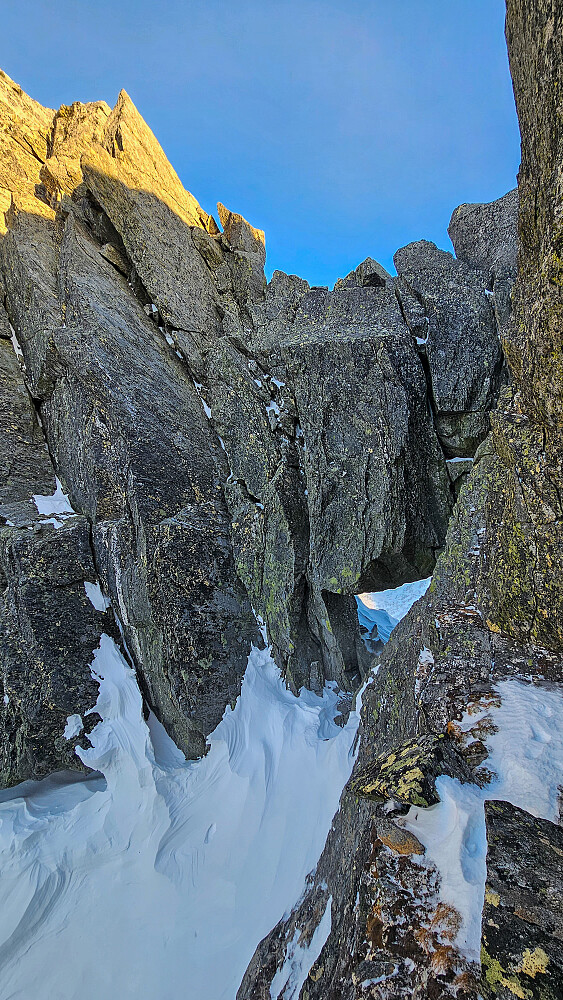 Jeg valgte å prøve meg på Hjellbønebba S1 fra sør etter kartstudie. Fant ingen bilder fra området eller skaret mellom S1 og S2, så det kom som en artig overraskelse å finne en slik unik fjellformasjon her. Store vertikale blokker (10m høy) var klamt fast inne i skaret med en tunell i underkant. Jeg kløyv over på toppen av denne noe som ga en grønngul trekant etter min variant. En del eksponering på påberegnes! Etter toppstøtet kløyv jeg ned i skaret og gjennom tunellen, artig opplegg.