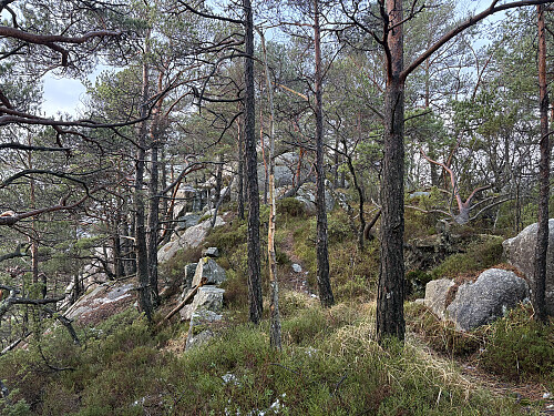 Det var ikke lange kjøreturen fra Foreknuten og til utgangspunktet for turen til Kattaborga. Jeg fant en fin p-lomme langs veien nordover til Viervågen. Herfra gikk jeg rundt Hammaren på en temmelig utydelig sti, forbi Hamratjørn og deretter på god sti opp til Kattaborga. Her var det noen bolter i fjellet etter et tidligere trigpunkt, og fin utsikt blant annet over til Høgebjør lenger nord. Fra toppen kunne jeg følge god sti via Kattaborga nord og videre til Høgebjør som er så vidt lavere enn Kattaborga. Det var veldig fint å gå her oppe, med et godt stinett. Jeg valgte å gå nede i dalen på østsiden på vei tilbake og droppet også runden rundt Hammaren.