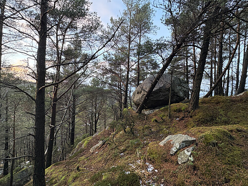 På vei tilbake holdt jeg meg oppe i høyden og tok avstikkeren oppom nabokollen Aust for Ramnafjellet også. Det ble litt artig småklyving opp til østtoppen som verken hadde noe markert toppunkt eller utpreget god utsikt. Etter avstikkeren kunne jeg fortsette videre på stien tilbake til bilen.