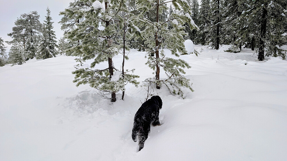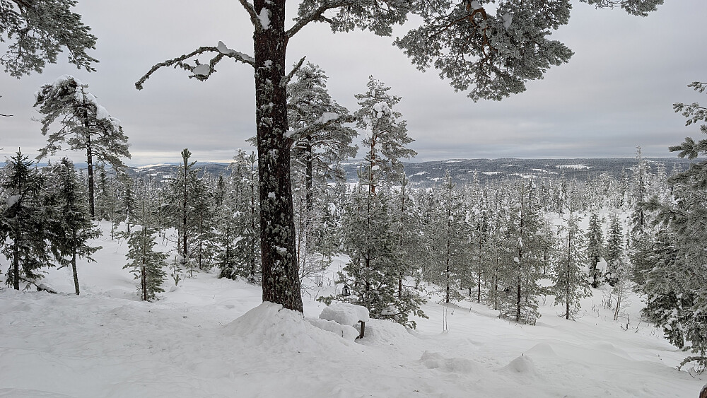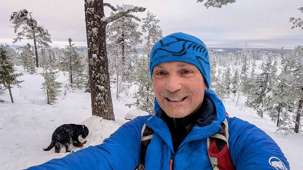Klarte å karre meg avgårde på en tur idag. Full av smertestillende medisiner. Gikk hjemmefra sammen med Embla. Hadde trugene på sekken og brukte disse siste kilometeren til toppen. "Overlevde" turen, men var forsiktig så jeg ikke skulle falle. Gikk uten staver idag grunnet smerter i overkroppen. Godt å komme seg ut å lufte seg litt. Gråvær og ca 1 minus.