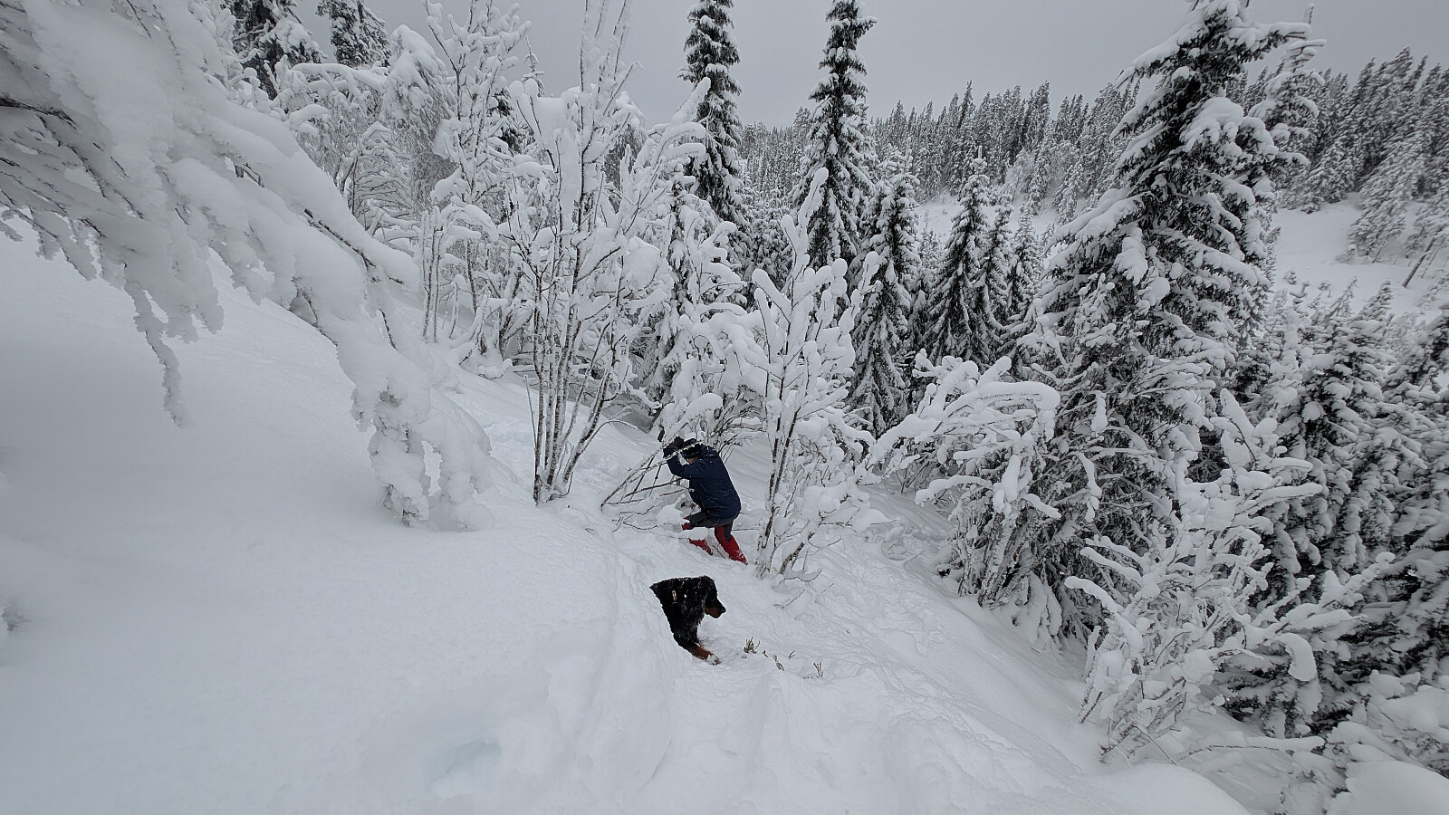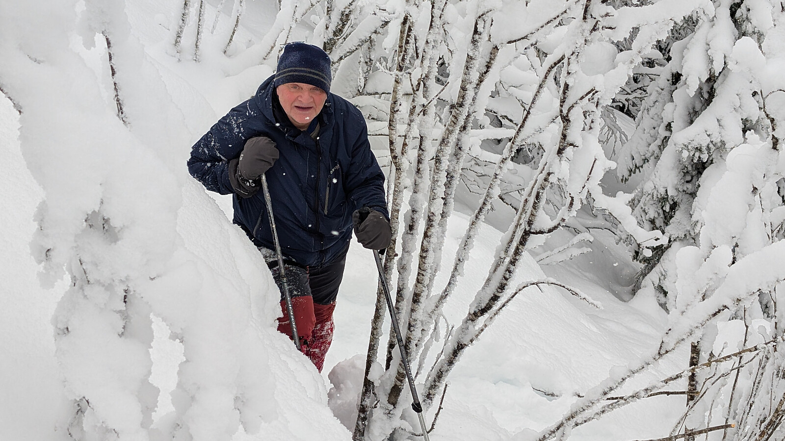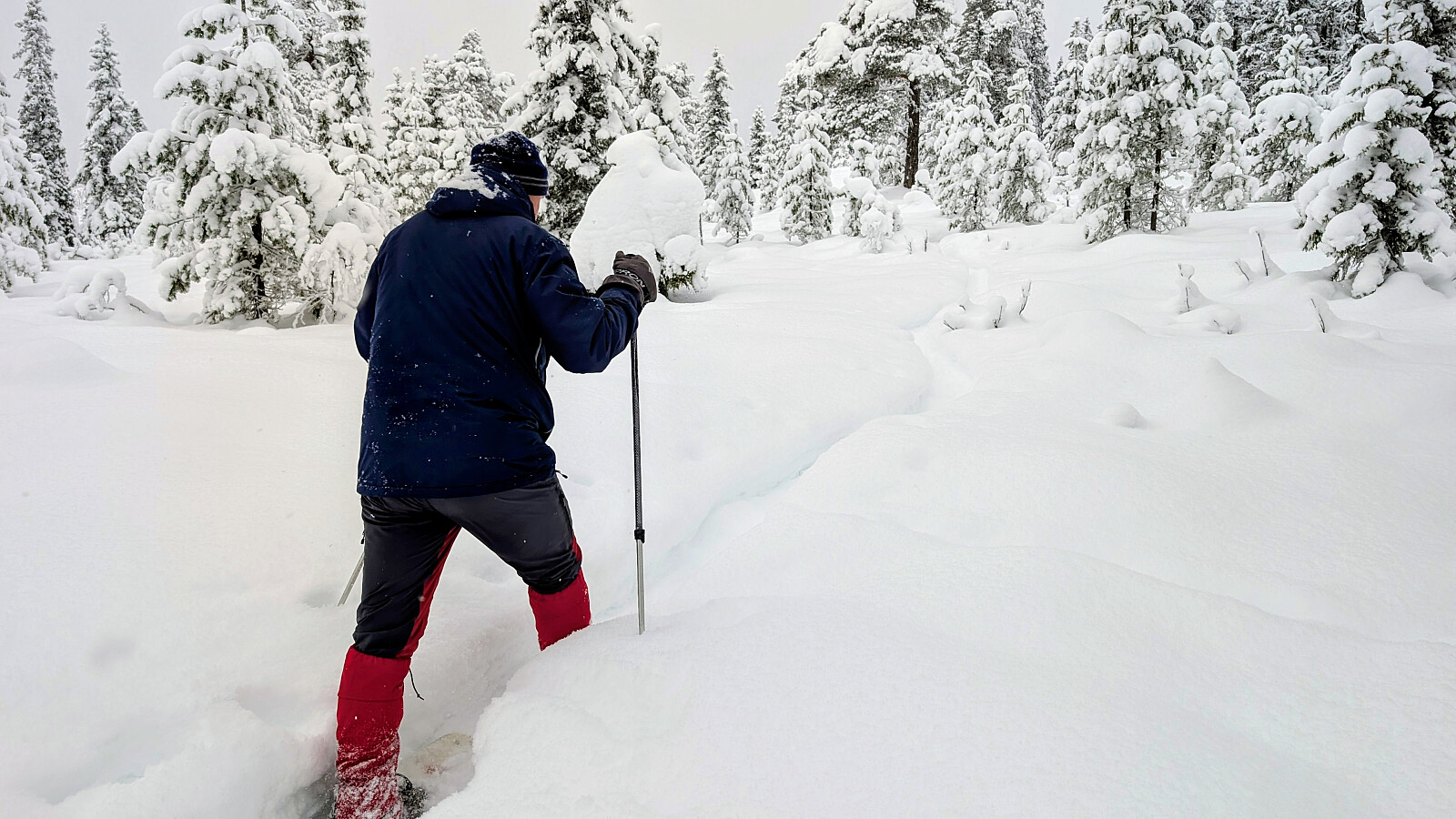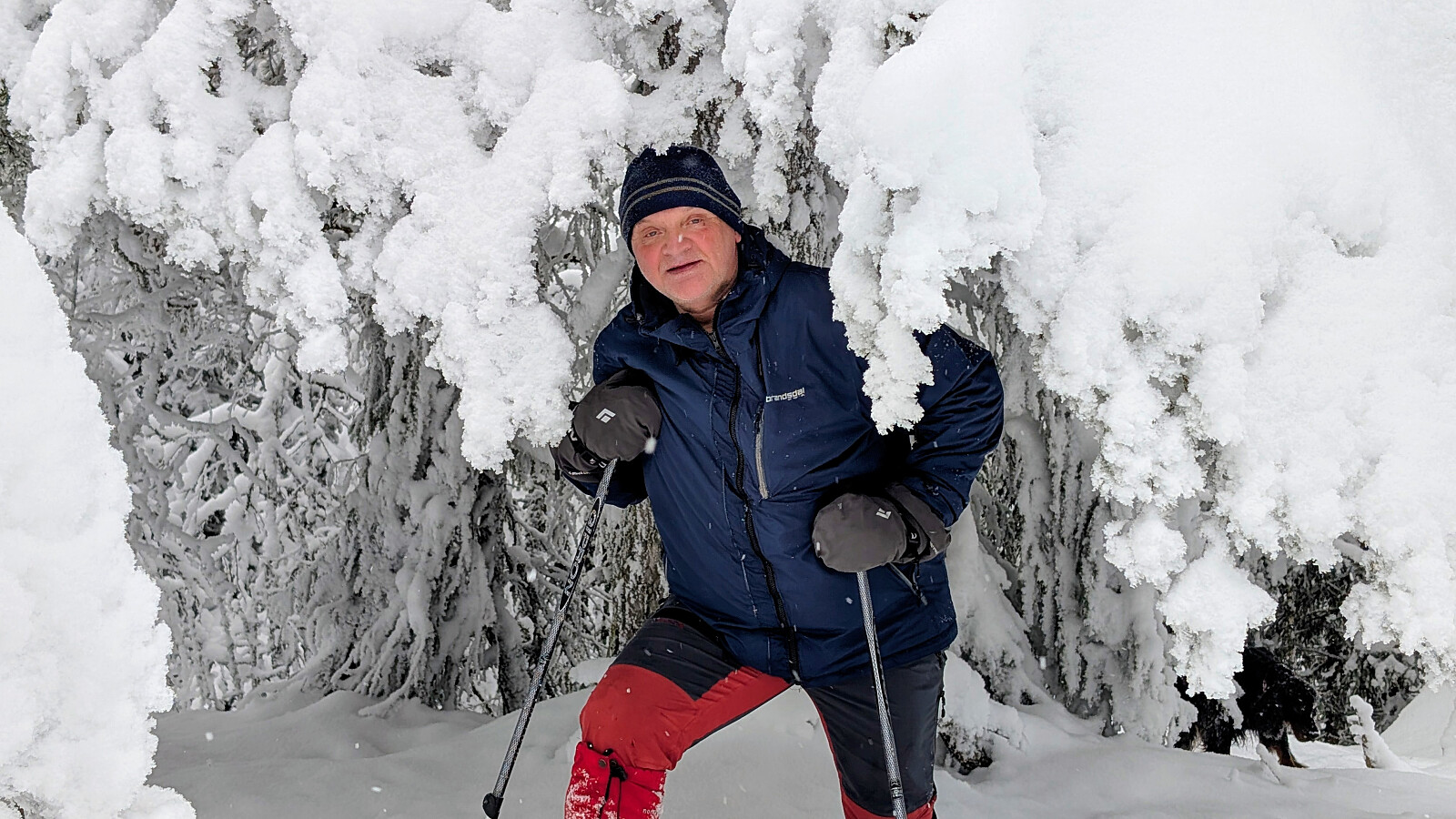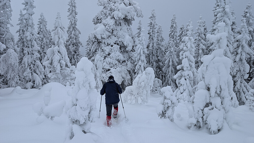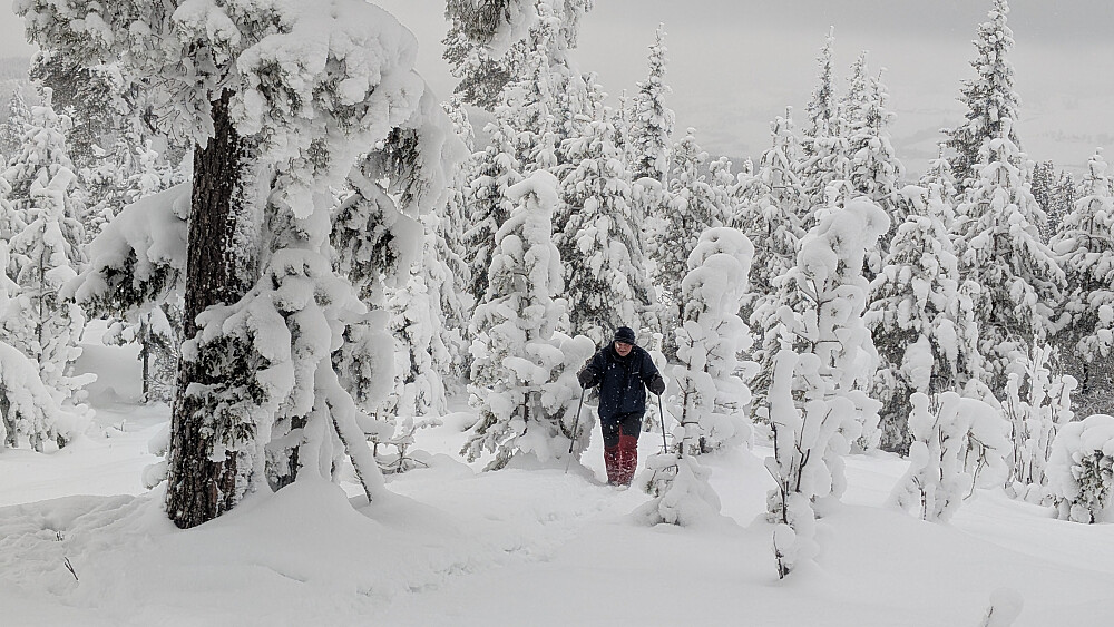Idag ble det en krevende trugetur. Turen gikk opp til Skonhovdhøgda og en runde der oppe i 50-60 cm løssnø. Litt kjedelig vær, men en fin tur i vinterskogen. Tur med Roger og Embla.