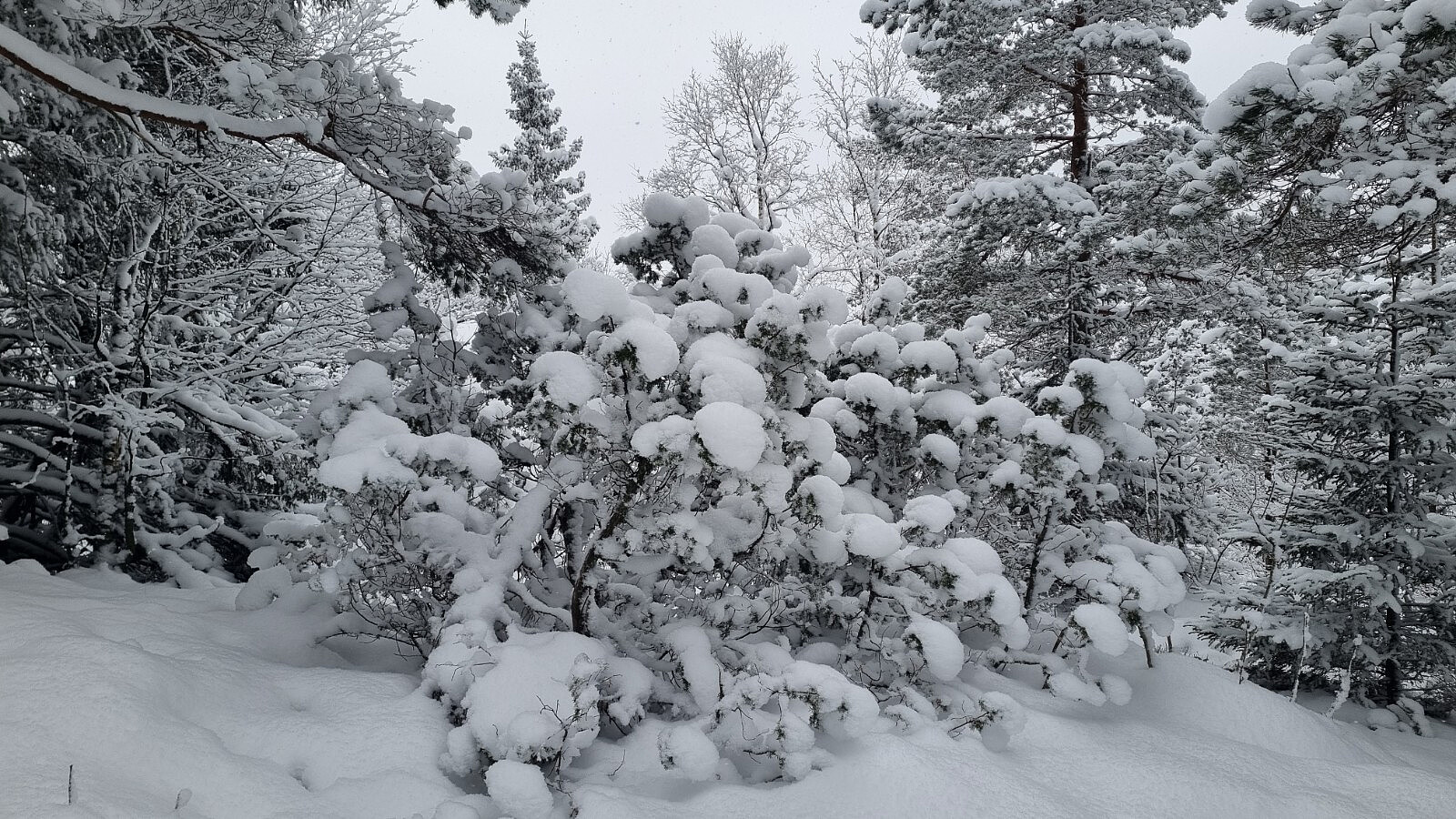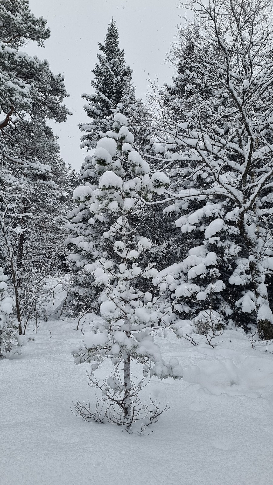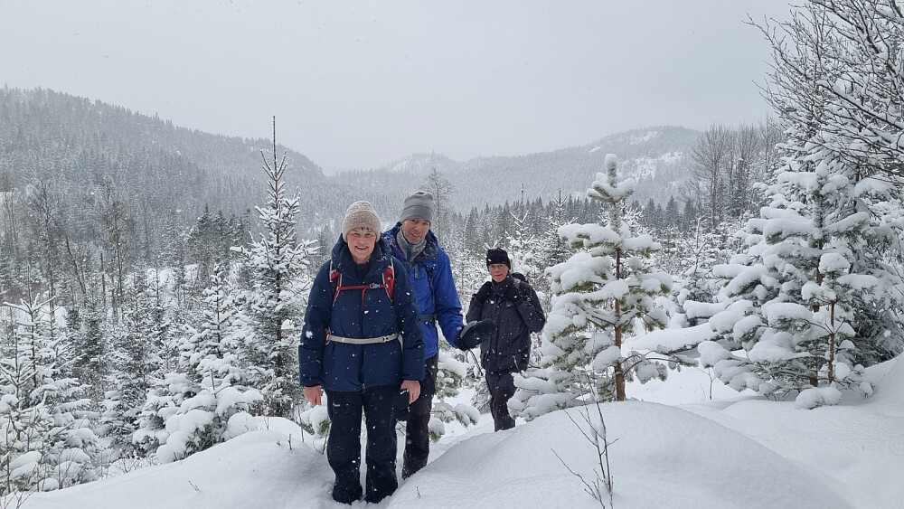 I snøværet tråkket vi oss opp til Blåfjell. Fyra i ovnen og stekte lapper på ovnen. Kosa oss i lenge i hytten her oppe i dag. Nydelig i skogen med alle trærne med snø på. Berit og Jan var med.