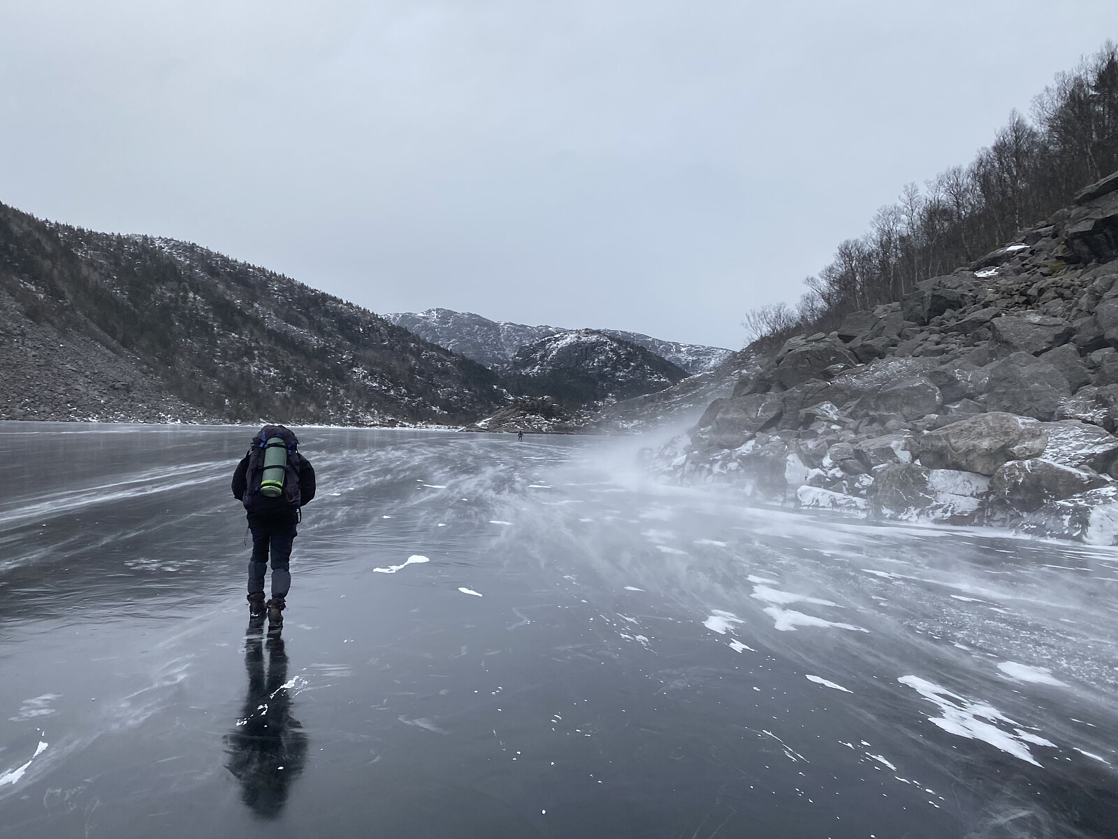Over isen på veg mot Grimsli, og det føykar beint imot
