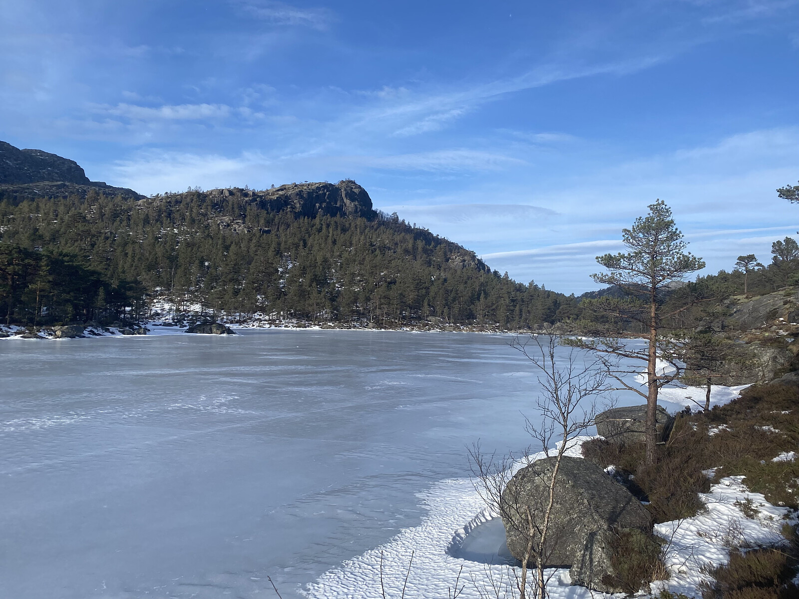 Litt over 5 timar på tur over isdekte vatn i Jørpelandsheia; fint vêr men svært kraftig austavind.